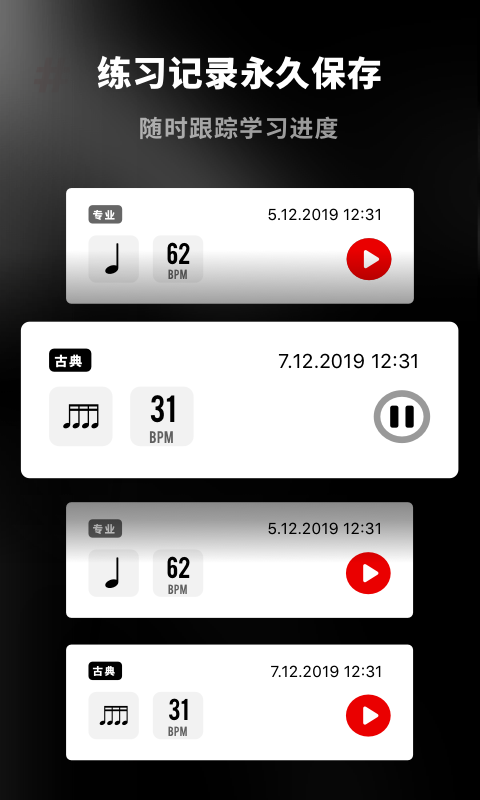 节拍器的播放历史会长期留存,您能够随时查看自己上一次的练习进度。