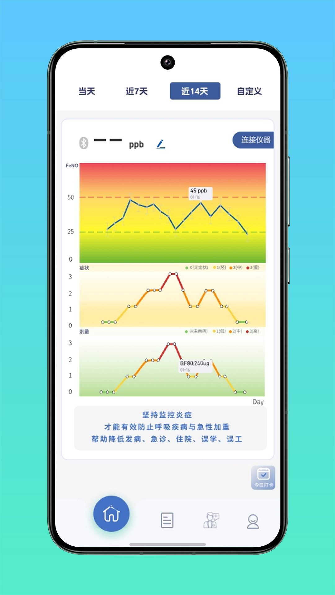 炎管家®APP帮助记录您或家人呼吸道的炎症指标-FeNO、症状与抗炎用药。研究表明,坚持炎症监控,可有效防治呼吸疾病与急性加重,30-60%降低发病、急诊、住院、误学与误工。