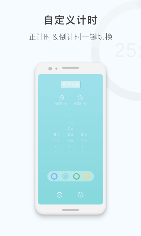 【自定义计时】可以一键切换正计时与倒计时功能,还提供专注蓝、护眼绿、舒缓黄等多款背景皮肤颜色供您挑选。