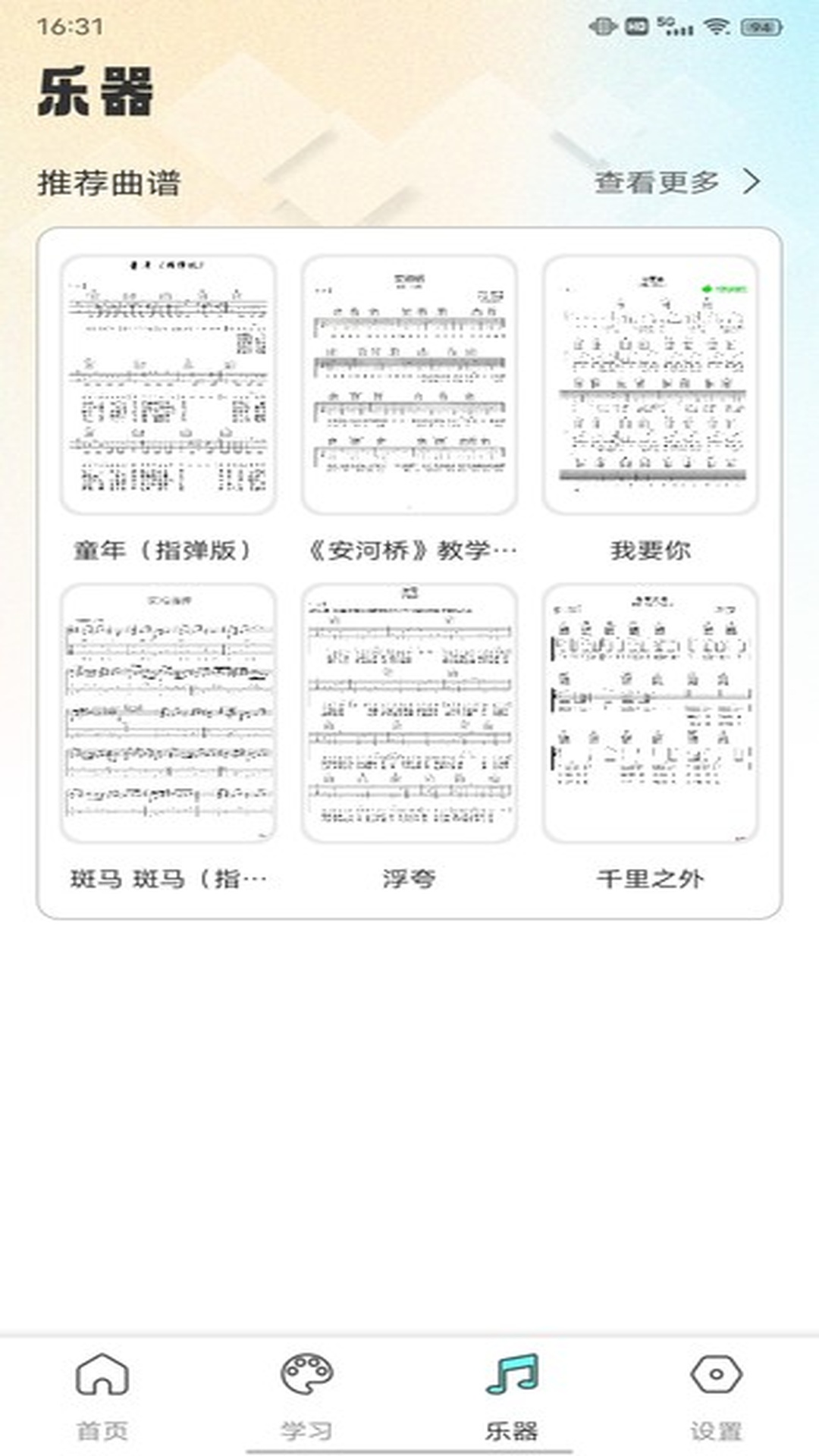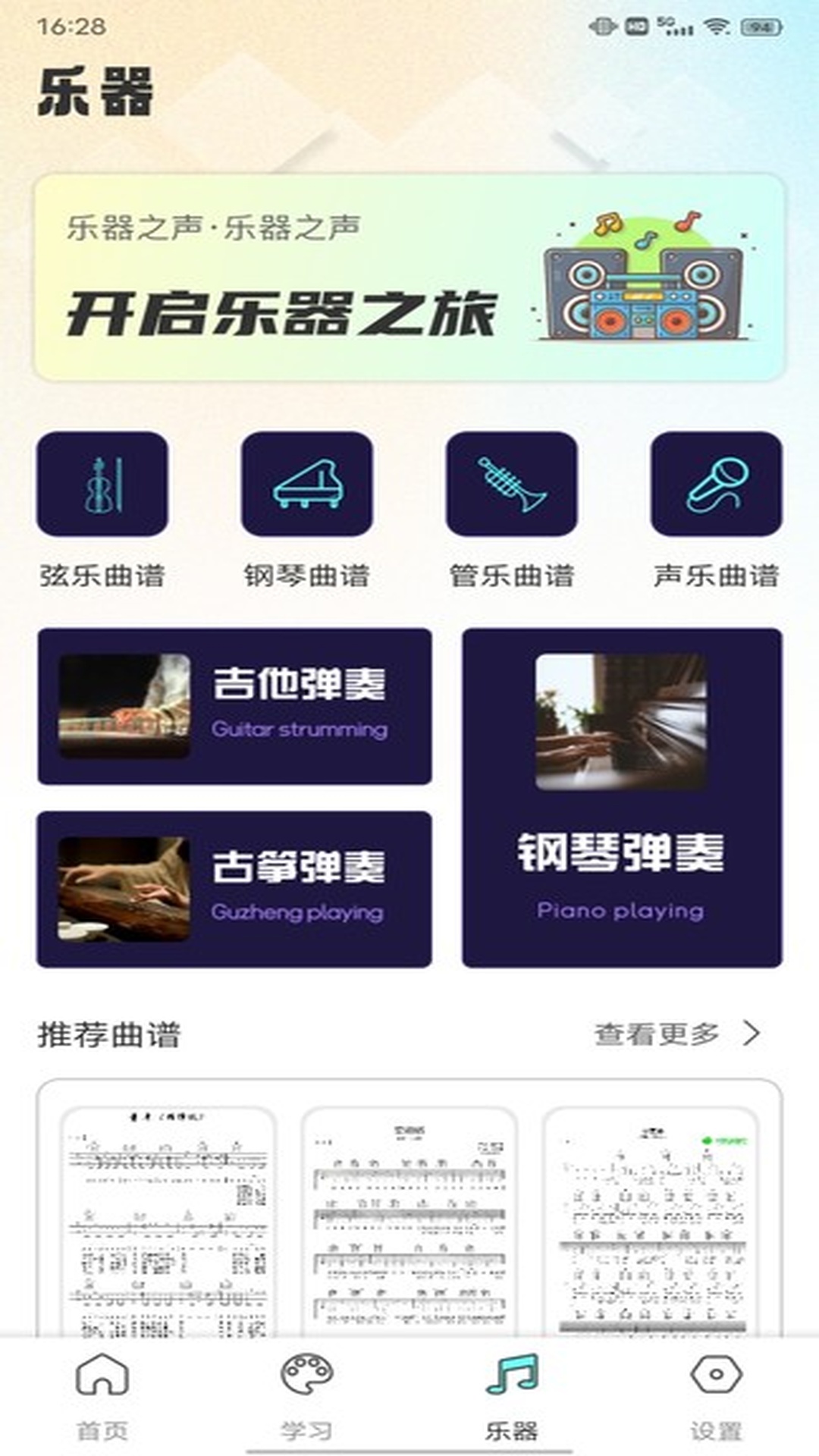 3、学习的闲暇之余,选择你喜欢的乐器,钢琴、吉他还是古琴,点击录制就可以开始你的弹奏表演了,选择保存,将你的独特创作保存下来。