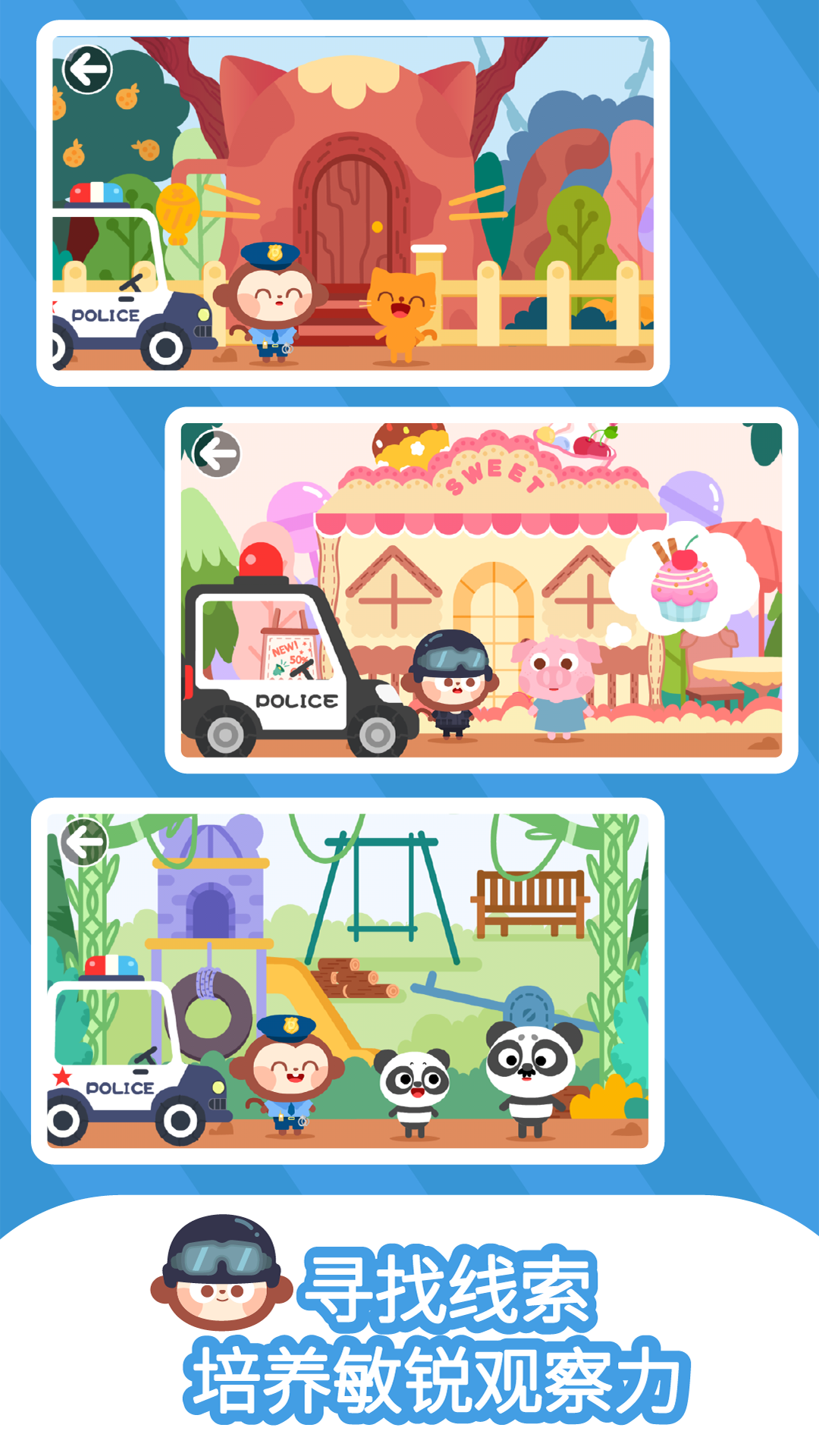 在游戏里有不同的案件场景,像丢东西啦、抓小偷呀、帮小朋友找爸爸啊,还有解决交通拥堵之类的。这么多不同种类的案件,会给小朋友带来各种各样不一样的破案体验哦。这可不仅仅是玩游戏呢,在这个过程中,小朋友要查找线索、寻找特征、分析案件、躲避障碍、追捕逃犯,通过这些操作,宝宝的反应速度、观察能力和分析能力都能得到训练,能让宝宝变得更加聪明、勇敢,让他们不怕困难,还乐于助人呢。
