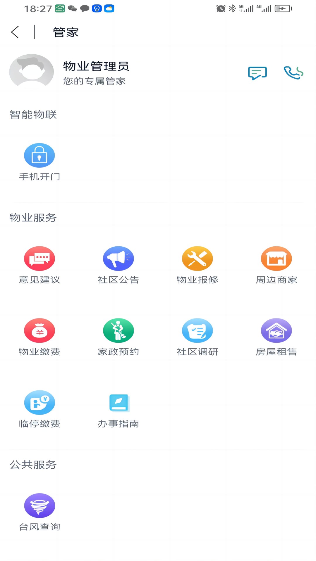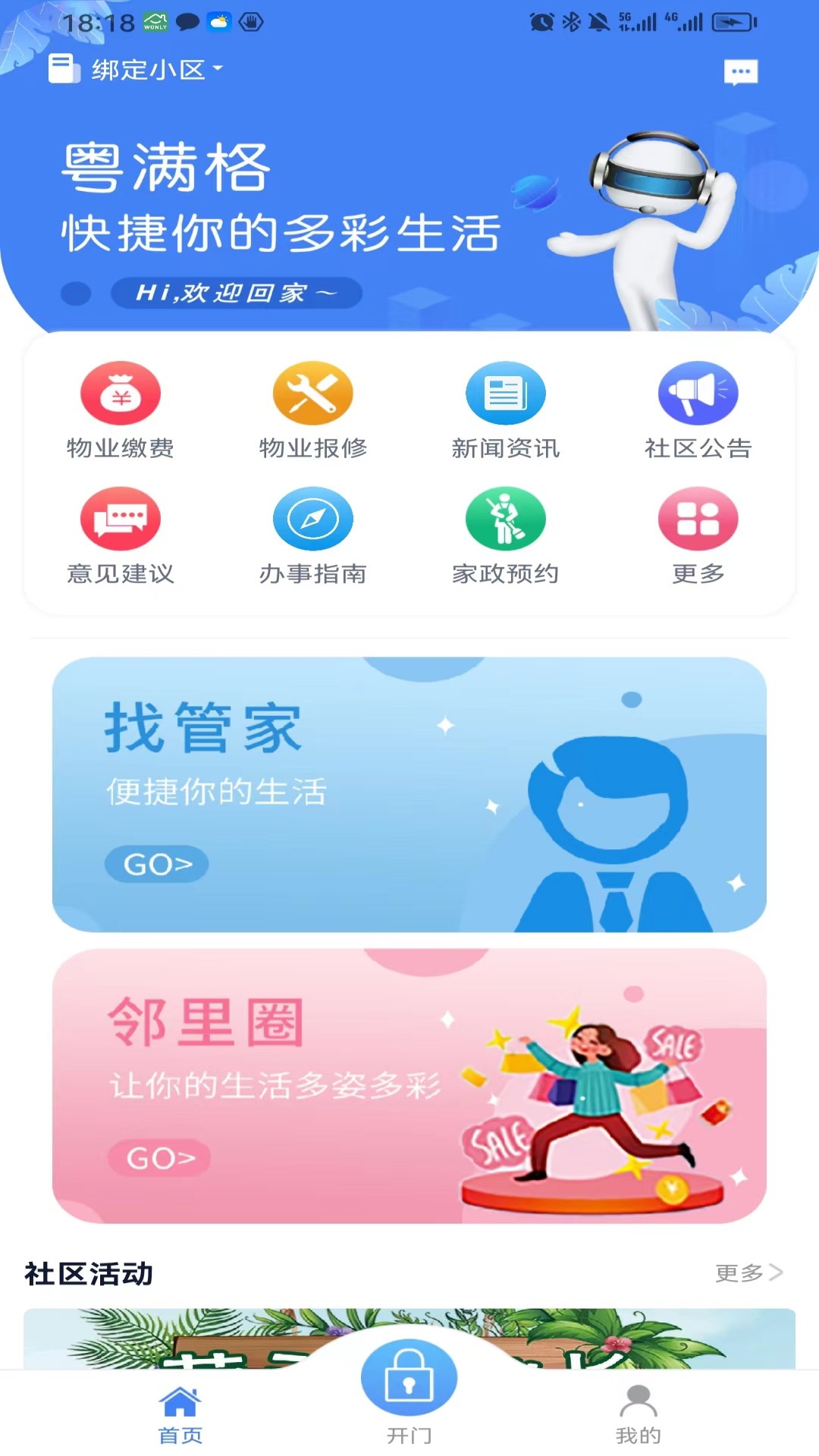 粤满格提供多种服务,包括手机开门、云对讲、在线监控等智慧物联服务;在线缴费、报修、投诉建议等移动物业服务;还有社区公告、小区调研、动态资讯等信息服务。