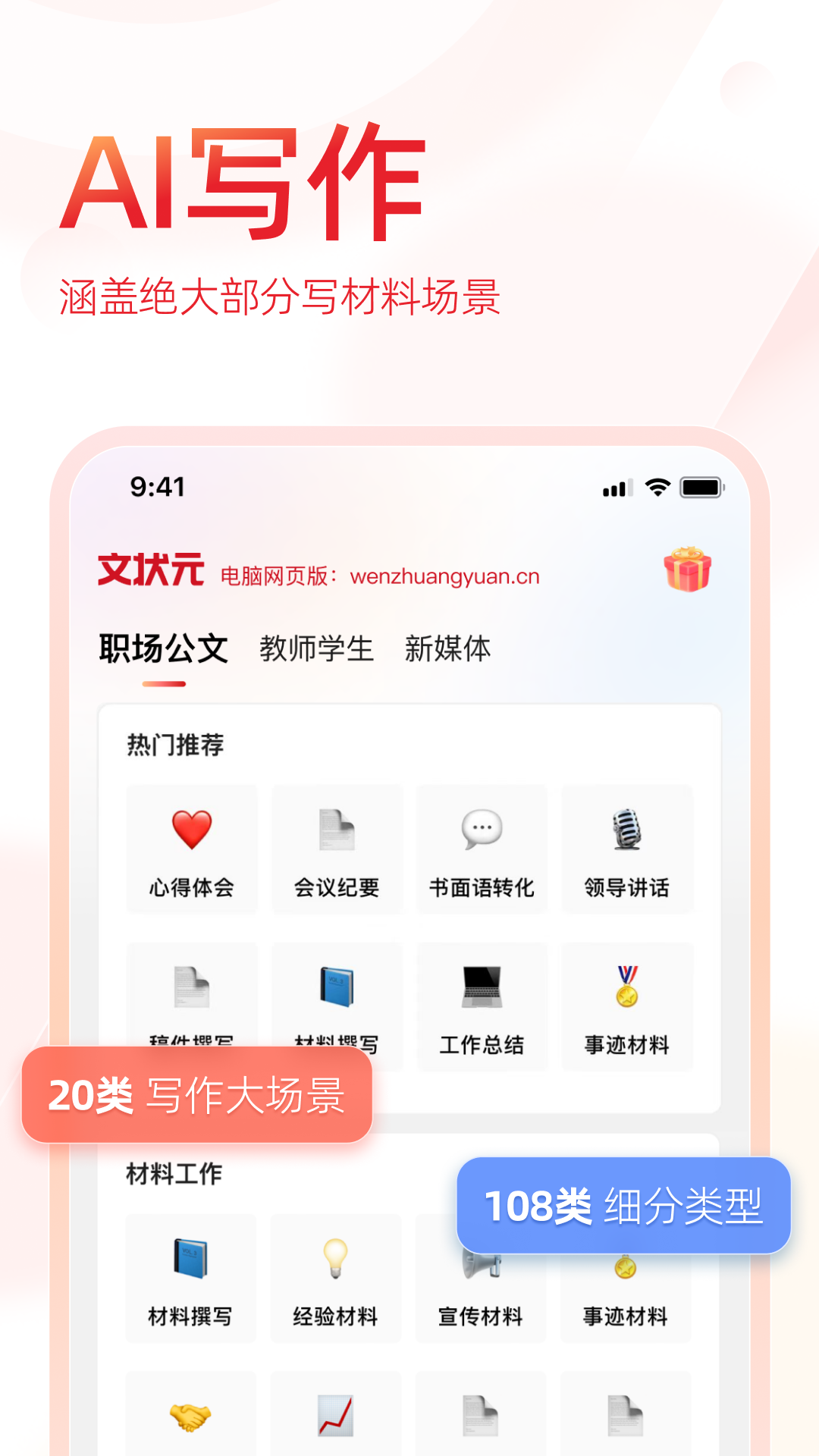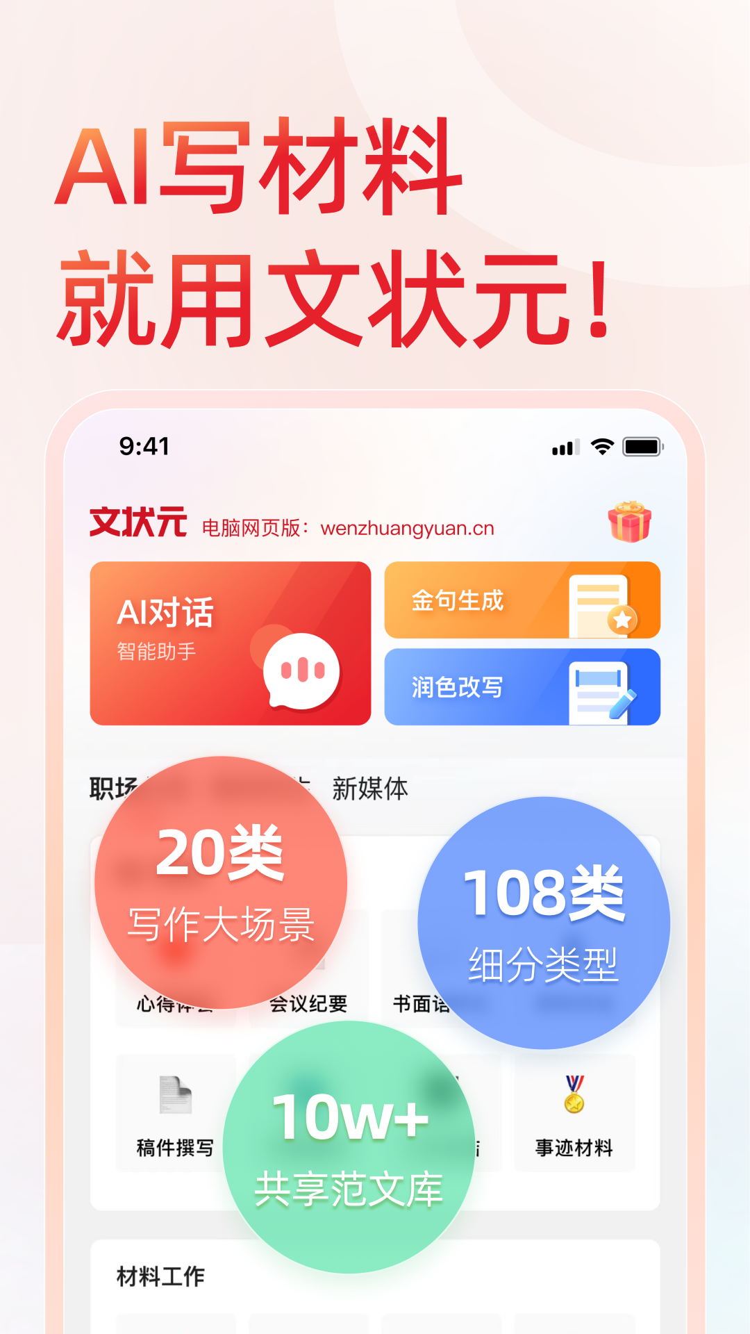 文状元AI是一款实用的公文写作工具。它以全新的公文大语言模型作为技术支撑,通过深度训练语言风格、动态更新时政内容,能够高质量地为用户提供20类写作大场景、108种细分类型、7大金句增强方向以及10万 + 的共享范文库,是大家撰写材料的得力助手!