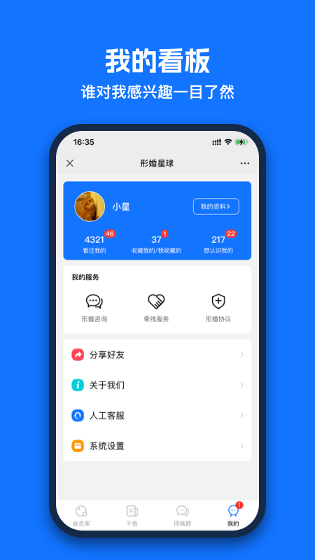 4. 我的:在此板块,您能清晰地知晓谁浏览过自己、谁收藏了自己、谁想要认识自己,所有信息一目了然。
