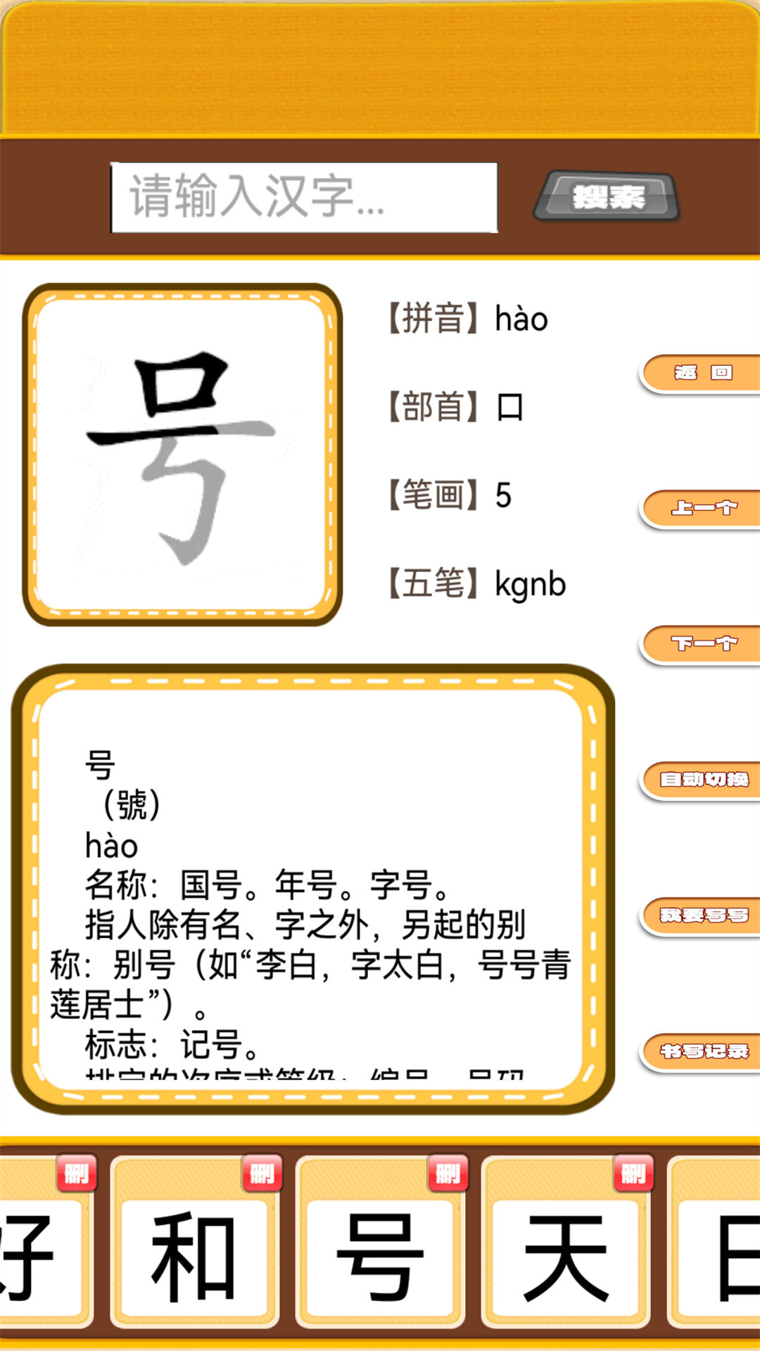 (3)汉字查询:没有想学的字怎么办,在这里上方搜索框输入想要学的汉字,中间是查询出的汉字信息,在下方左右滑动查看搜索记录,快来写一写你要学的字吧。