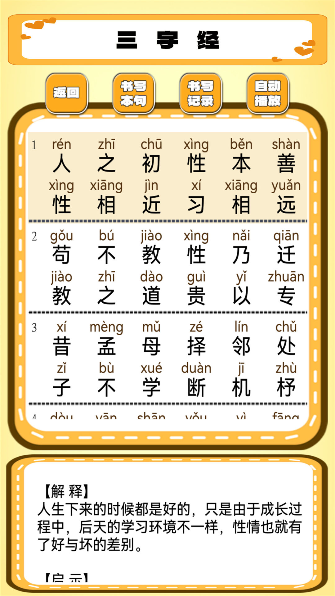 (2)三字经,弟子规,千字文,百家姓:带拼音以及注释,会写的同时也帮助理解含义。
