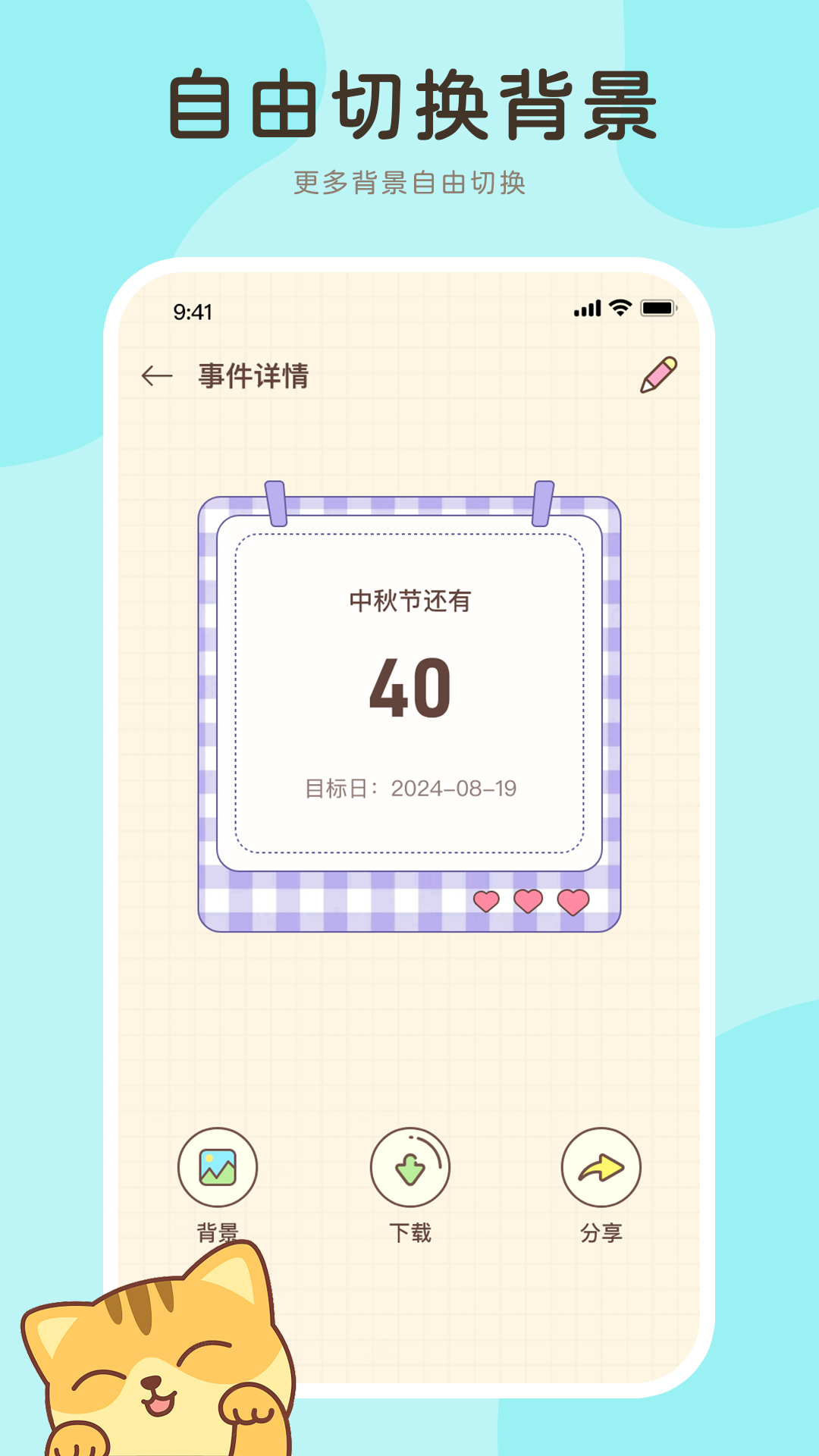 一、便捷的使用体验 小巧轻便不占内存,自定义提醒时间,贴合你的习惯。 二、灵活的周期记录 支持周期记录,轻松应对重复日程,无需反复设置。 三、贴心的提醒服务 贴心提醒提前告知,让你有充分时间准备,不错过任何重要行程。 四、强大的记录功能 无论是伴侣的生日、信用卡还款,还是宝宝的成长节点,这款软件都能准确记录。 有了它,特殊日子尽在掌握。