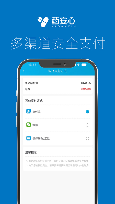 药安心凭借互联网 + 医药的创新模式,致力于为药品经营企业打造便捷的B2B药品采购服务。平台严格遵循国家相关法律法规诚信运营,始终秉持为广大客户提供“质量上乘、价格合理”的产品这一理念,全力打造服务型医药商业供应链平台。
