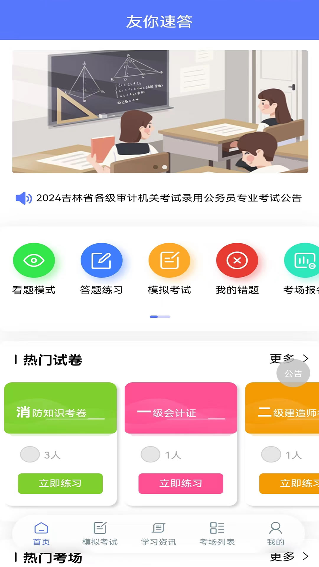 友你速答是一款为知识爱好者学习设计的知识学习类应用,涵盖多科目练习,模拟考试,学习咨询,通过学习强化自我。