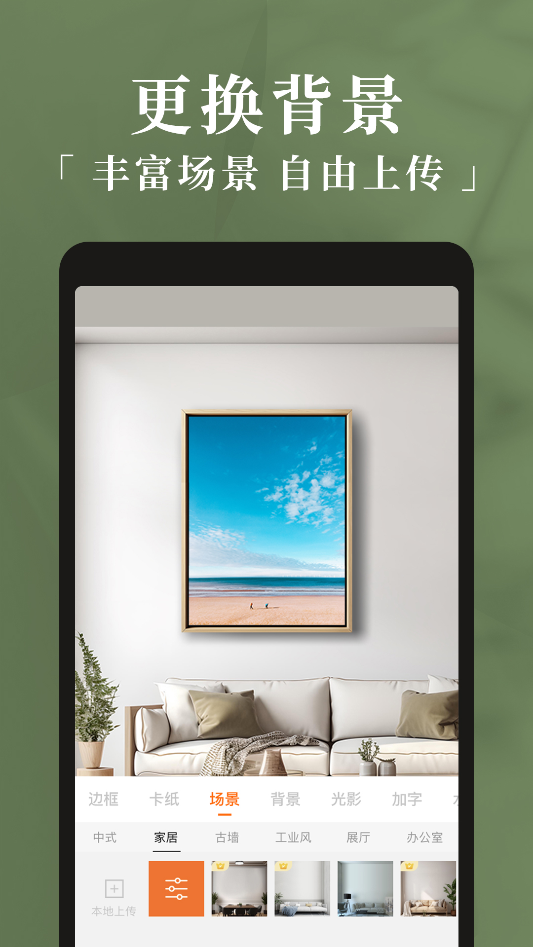 背景变换:只需一键操作,即可更换背景,瞬间改变作品的展示效果。背景包含纯色、墙壁以及空间场景等丰富类型,同时还支持自由上传。