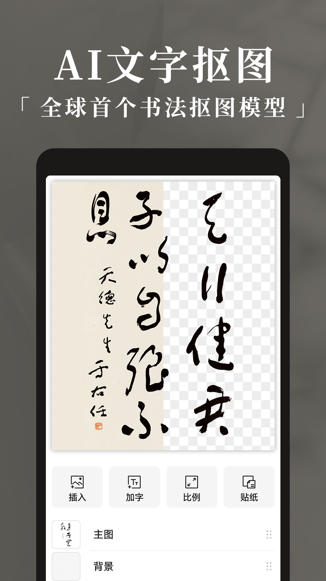 AI文字抠图:借助我们专业的AI模型精确地提取文字,并且可以随意更换背景。这项功能可用于书法去皱、书法美化以及为图片添加文字等操作。