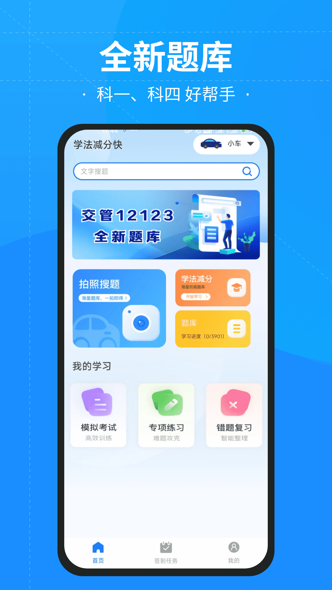 是一款为驾考考生提供驾驶员考试题库练习和模拟考试的App。App中不仅支持科目一和科目四两个驾考科目的学习,也包含了小车、客车、卡车、摩托车四种车型可供考生选择。