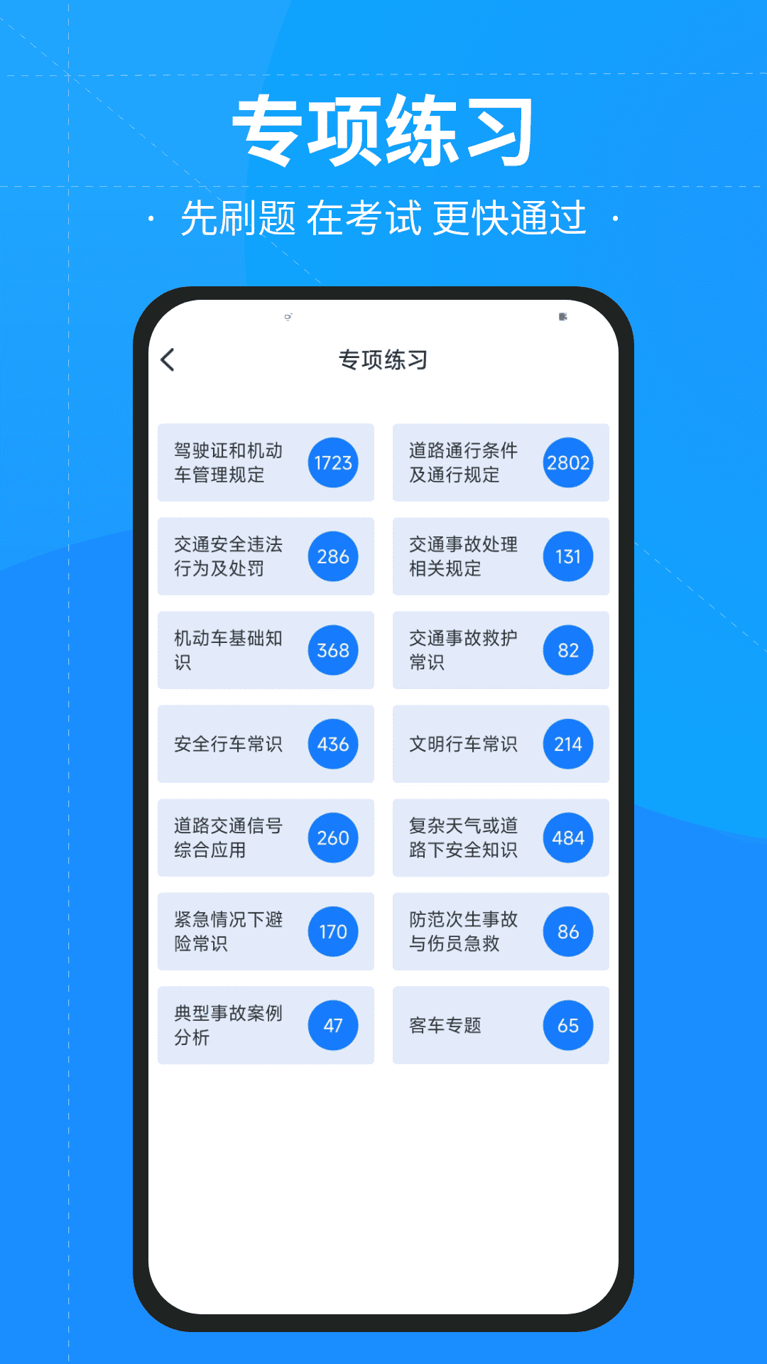 专业服务于科目一和科目四的驾驶员考试,为考生提供全面的题库和全真模拟考试的平台,还为考生详细的分析每一题的答案,有效地帮助考生快速通过科目一和科目四考试。