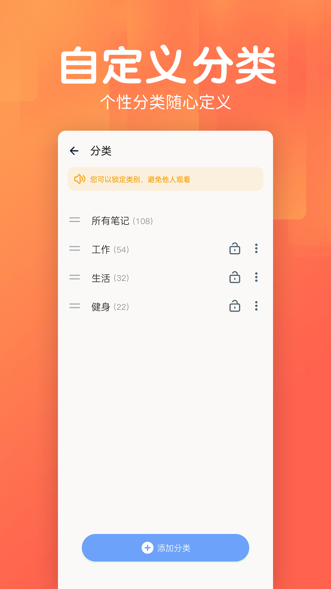 2. 分类记事:通过分类管理笔记,查找起来十分方便,所有笔记都能迅速被找到。