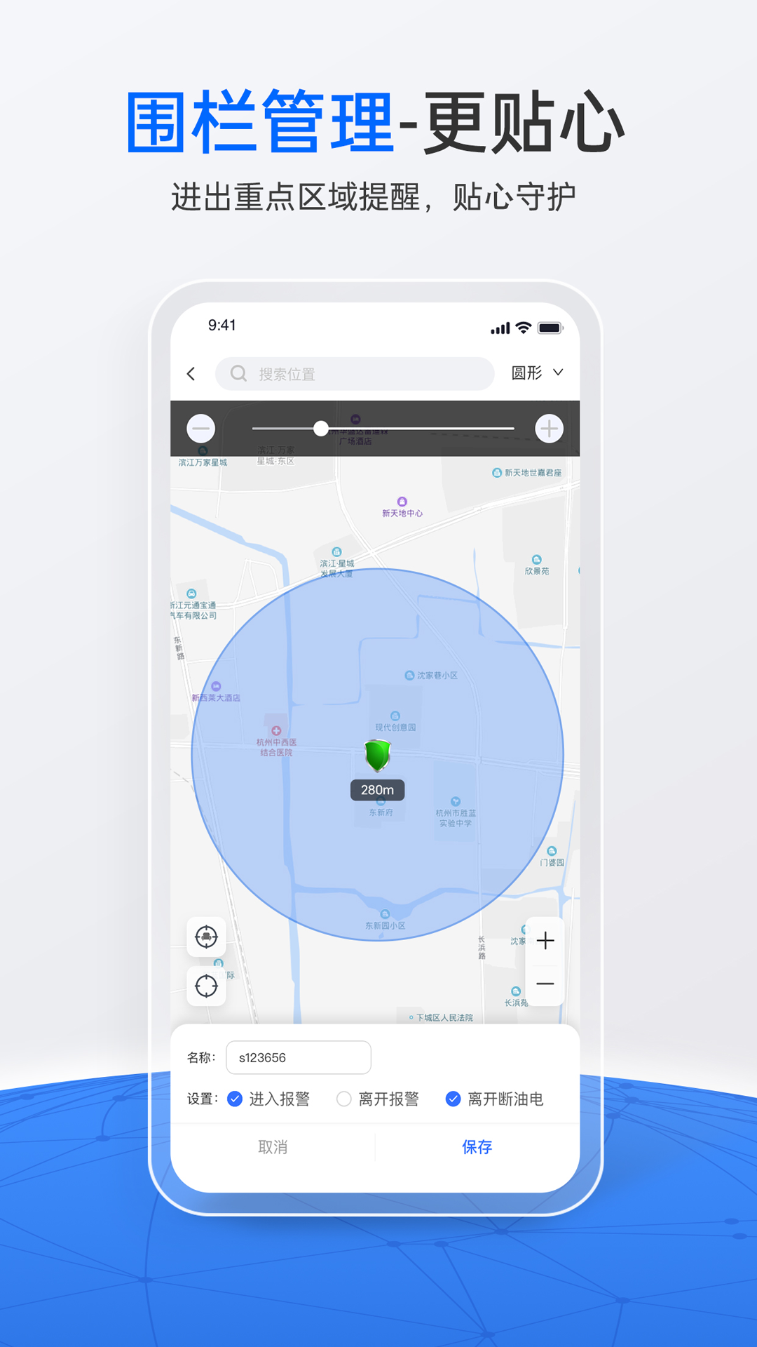 - 提供多种自由形式的围栏设置,用以限制车辆行驶区域,当车辆进入或离开限定区域时会触发报警,有效管理车辆行驶范围。
