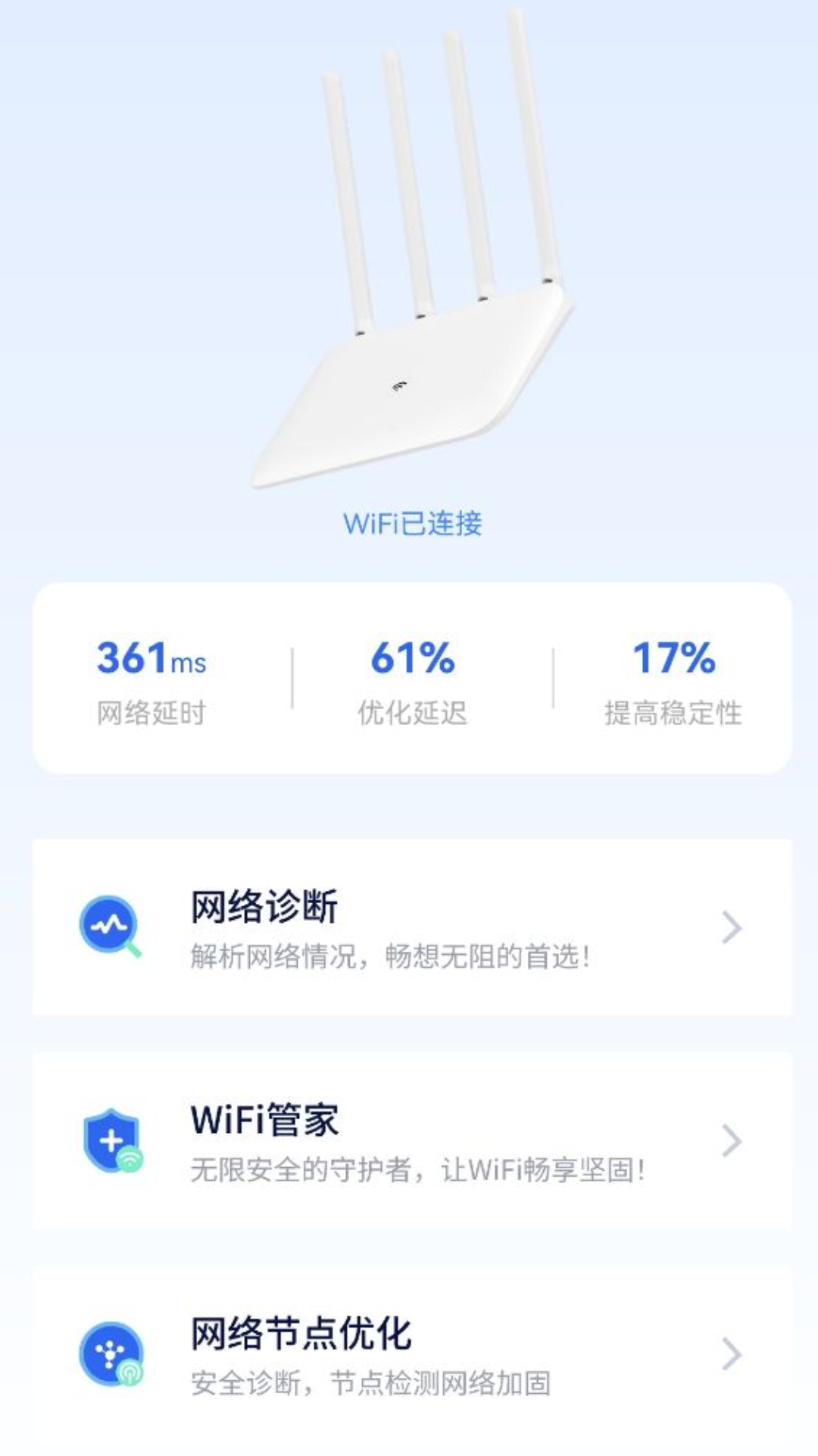 WiFi管家:对您的网络连接状态进行实时监测,保证您随时都有良好的上网体验。其网络诊断功能可自动查找网络问题并给出解决方案,助力您迅速恢复连接。而且,它还有网络节点优化功能,能够自动对信号强度和稳定性进行优化,不管您是在家还是外出,都可以随时畅快地享受高速互联网。