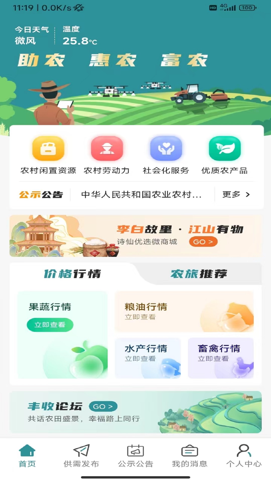 在江丰收上,用户还能查看果蔬、粮油、水产、畜禽等农产品的价格行情,了解市场动态,为农产品的交易提供参考。同时,平台还推荐农旅景点、住宿餐饮等信息,助力乡村旅游的发展。