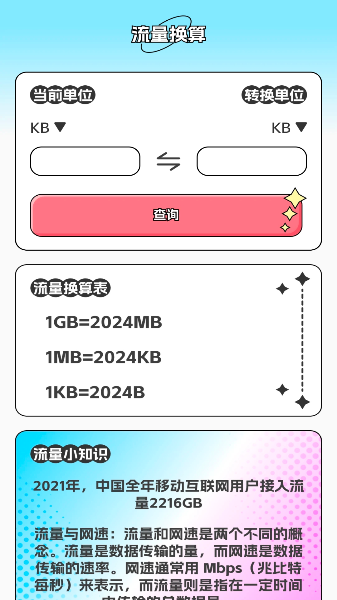 无需再为不同流量单位之间的换算而发愁啦!好彩流量具备便捷的流量换算功能,多种常见流量单位之间的转换都能轻松搞定。而且还有流量小知识,助力您深入理解并更好地管理数据流量。