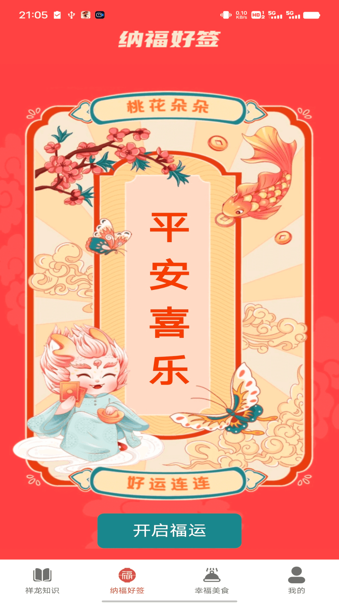 灵感源于华夏文化中的祥龙图腾,融合丰富的龙相关知识与吉祥寓意。不仅能探索神秘的龙文化世界,更能每日抽取纳福好签,借祥龙之瑞气,祈愿生活美满、事业兴旺。独特功能“今日食运”,随机推荐契合时宜的美食,让用户在品味佳肴中,增添日常乐趣与福气,实现“吃出好运,纳福在心”