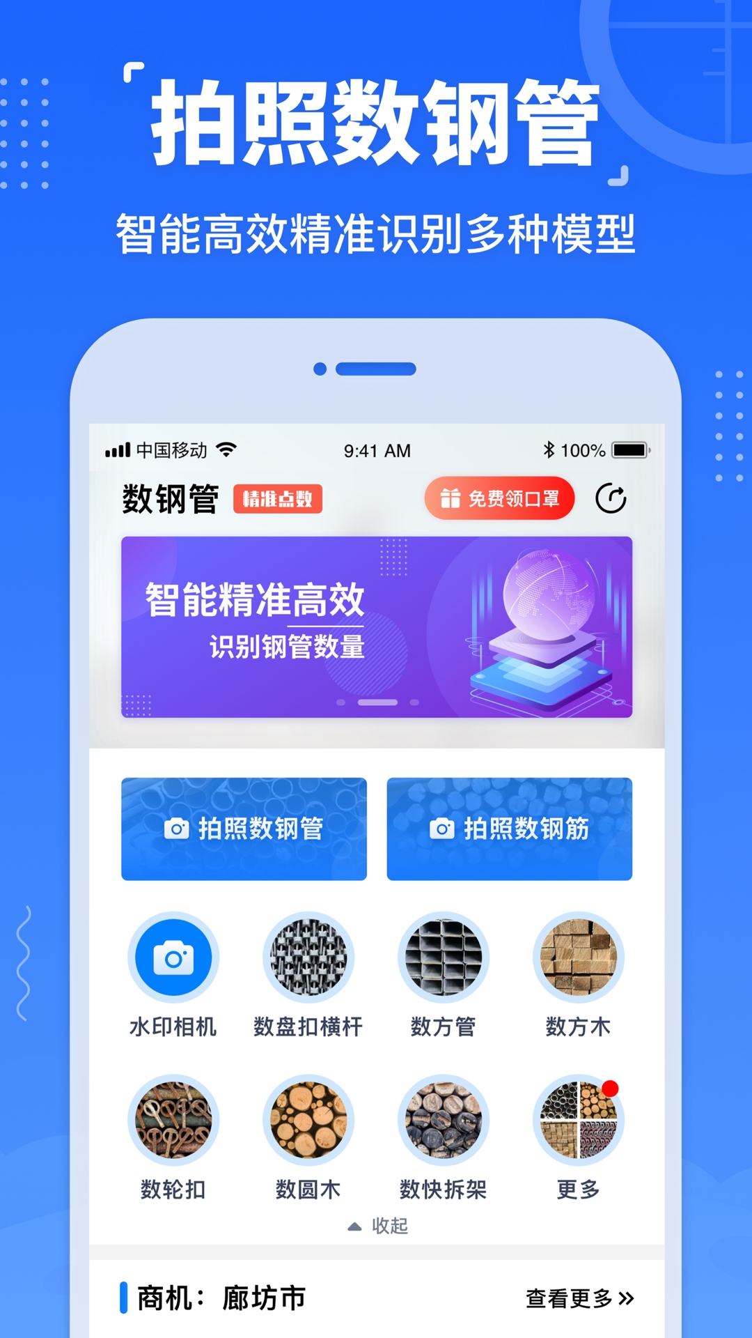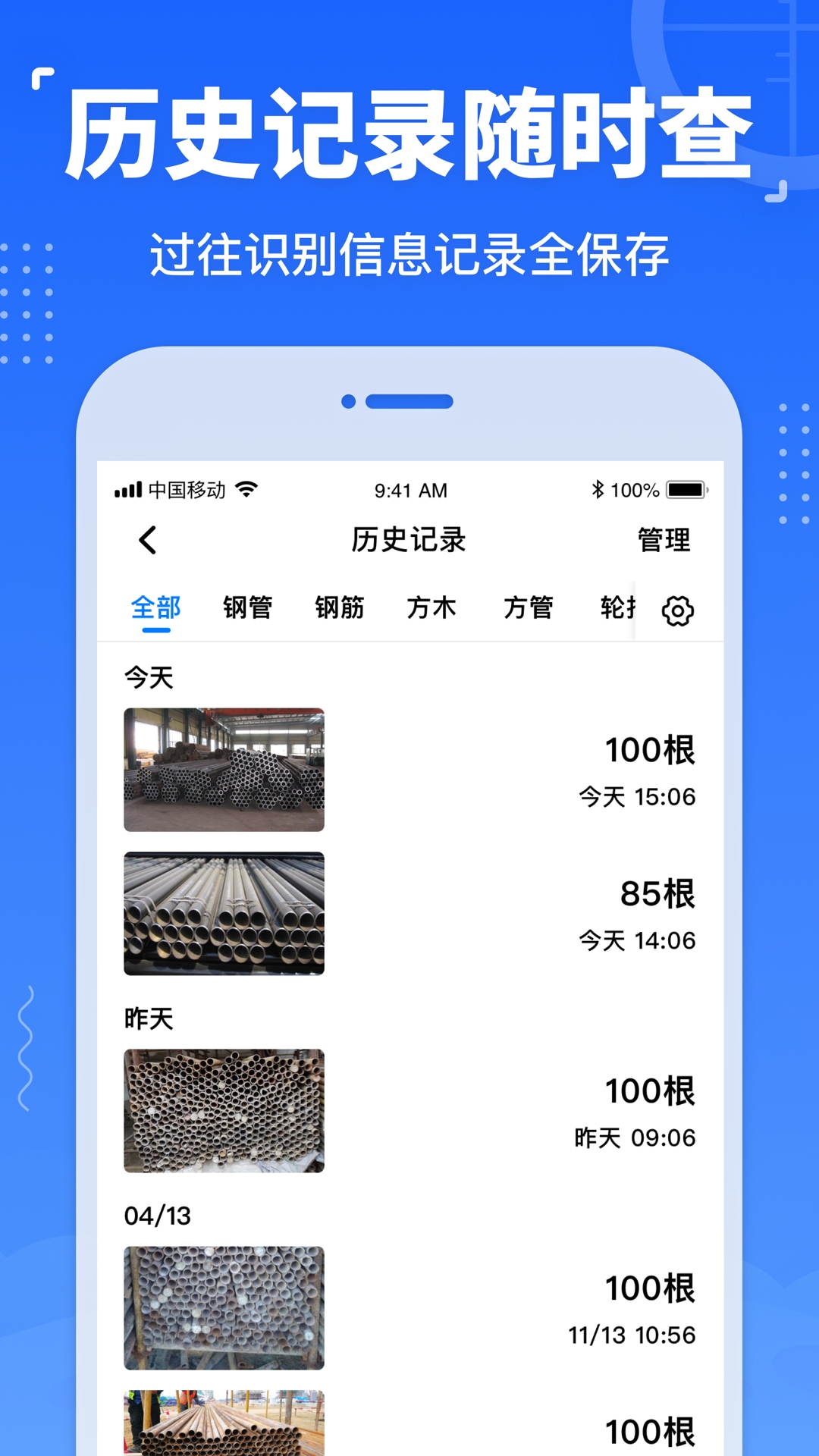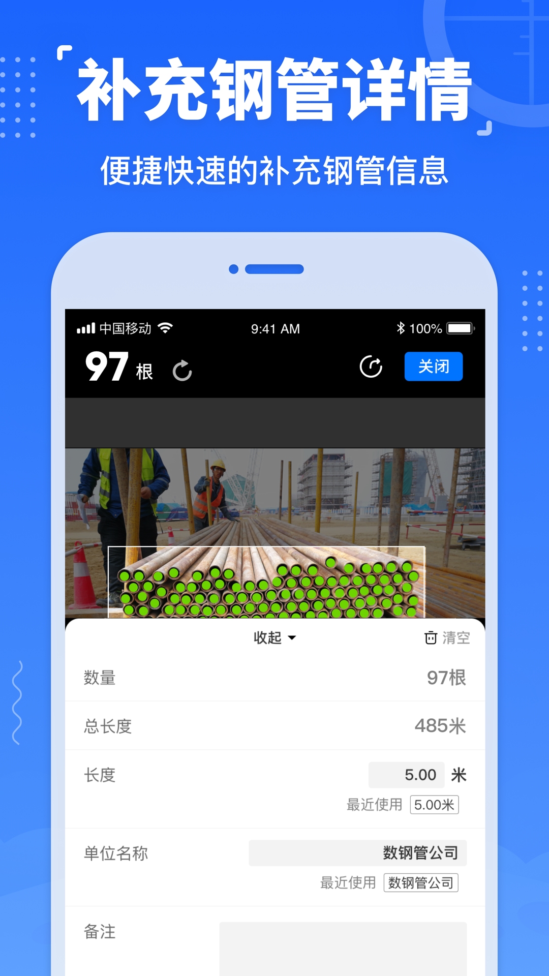 同时支持通过拍照或者从相册中选择照片的方式来识别钢管数量。
