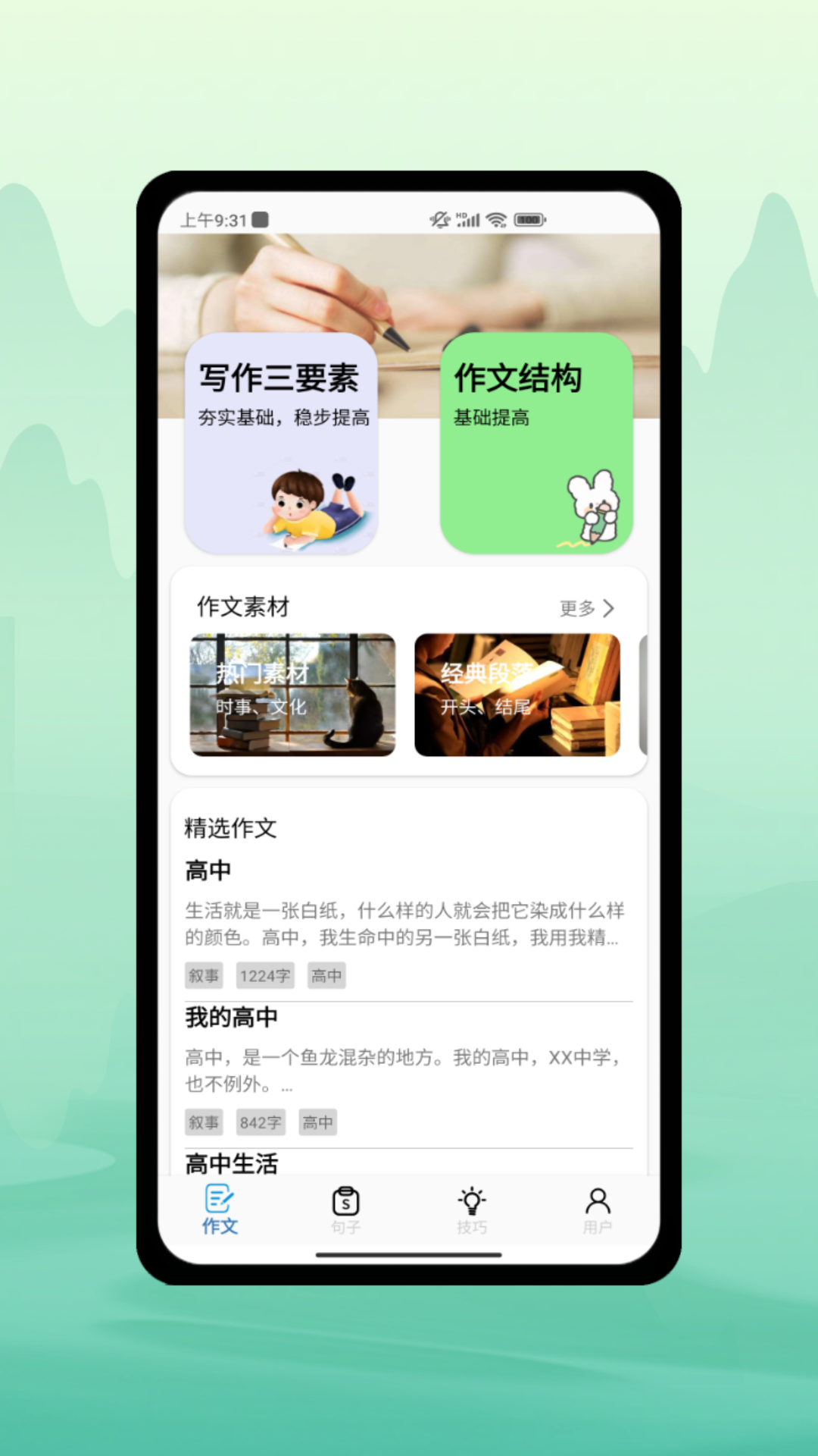 本软件能够满足不同年级段学生在作文写作指导方面的需求。此外,软件还收集了各种各样的名言名句以及丰富的写作素材,这些内容可以让你的作文如虎添翼,使其观赏性和可读性更强。软件提供热门素材,说不定其中某个素材就会在高考作文中派上用场呢。