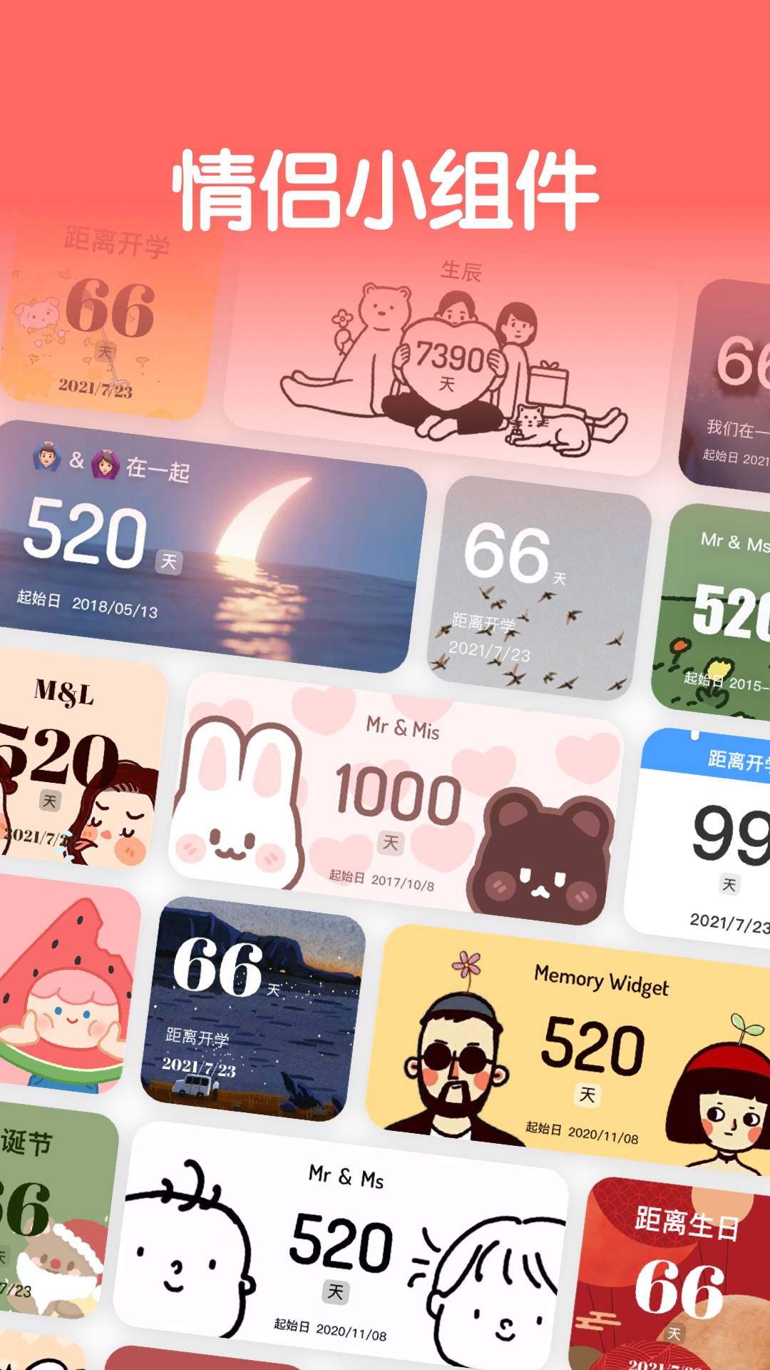 - 这里提供了数十款超可爱的主题风格,您可以在手机主屏幕同时创建多个纪念日小组件。
