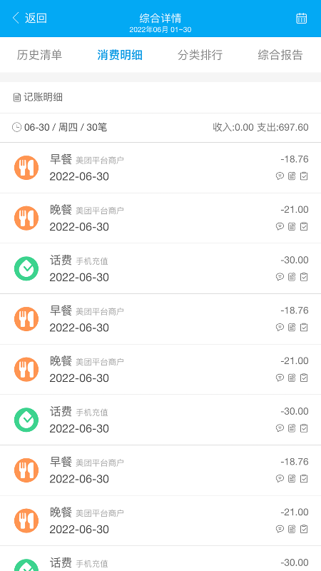 - 记账明细:将收支、还款、收款、借入、借出等各类记账进行整洁归类。