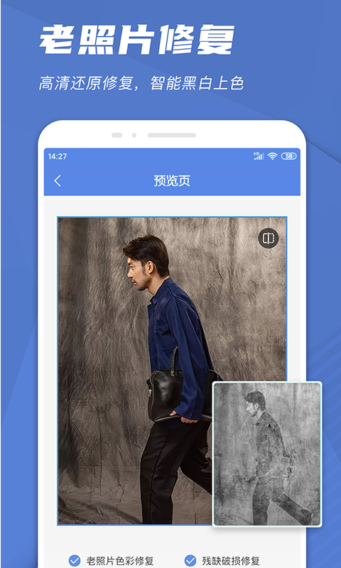 可智能还原照片颜色,修复照片破损之处,提高照片清晰度,让老照片重新焕发出光彩。