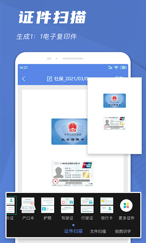 此功能支持身份证、银行卡、驾驶证、行驶证、护照等多种证件的扫描,能按照1:1的比例还原到A4纸上,并且一键就能导出电子证件复印件。