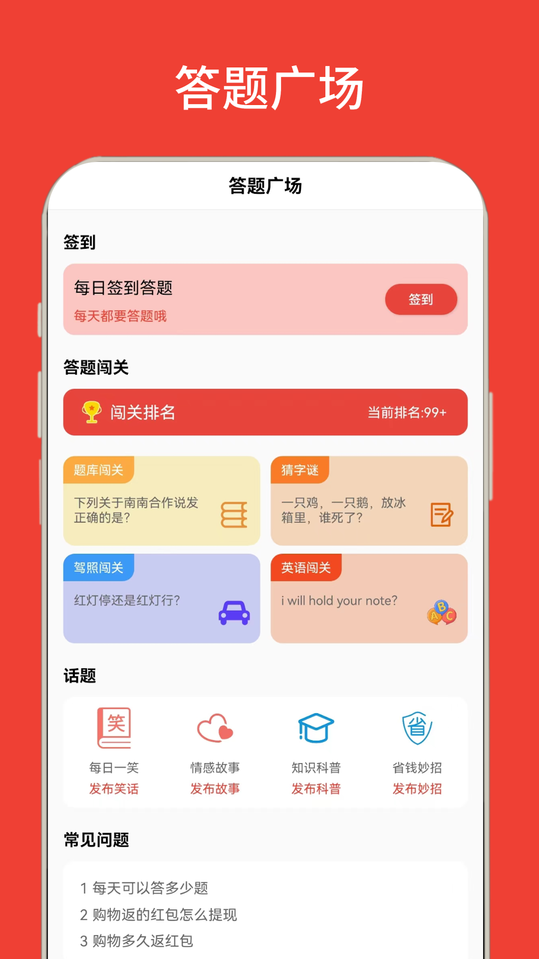 我们的目标是为用户打造丰富多元的答题体验,使用户能够在轻松愉悦的环境里不断增长知识。此外,我们还推出购物返金币的福利,使您能够将智慧转变为实实在在的收益。