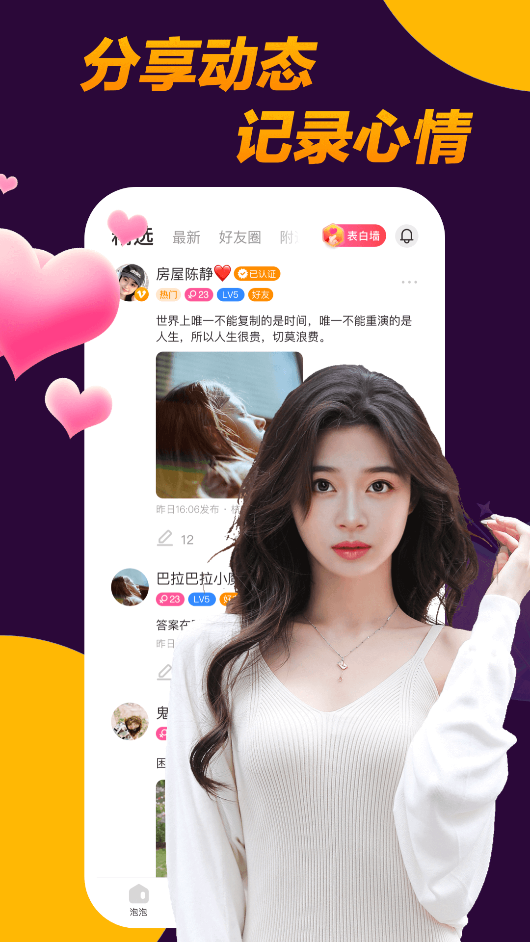 快来体验探索【附近泡泡】这款交友软件。单身贵族们交友聊天,打发无聊,马上脱单,让你随时随地不再孤单!