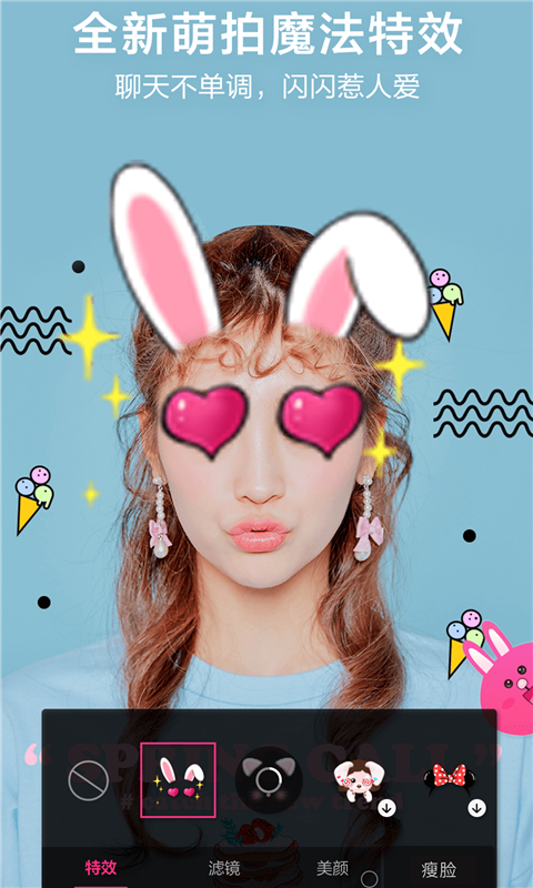 一款女生微信视频时自动美颜美白的神器。摆脱原相机视频的粗糙画质,还原你本来的美貌。支持一键美颜设置“大眼瘦脸”,“美肤美白”,“动态贴纸”“美妆滤镜”等美妆效果的APP,堪称微信版的“美颜相机”。