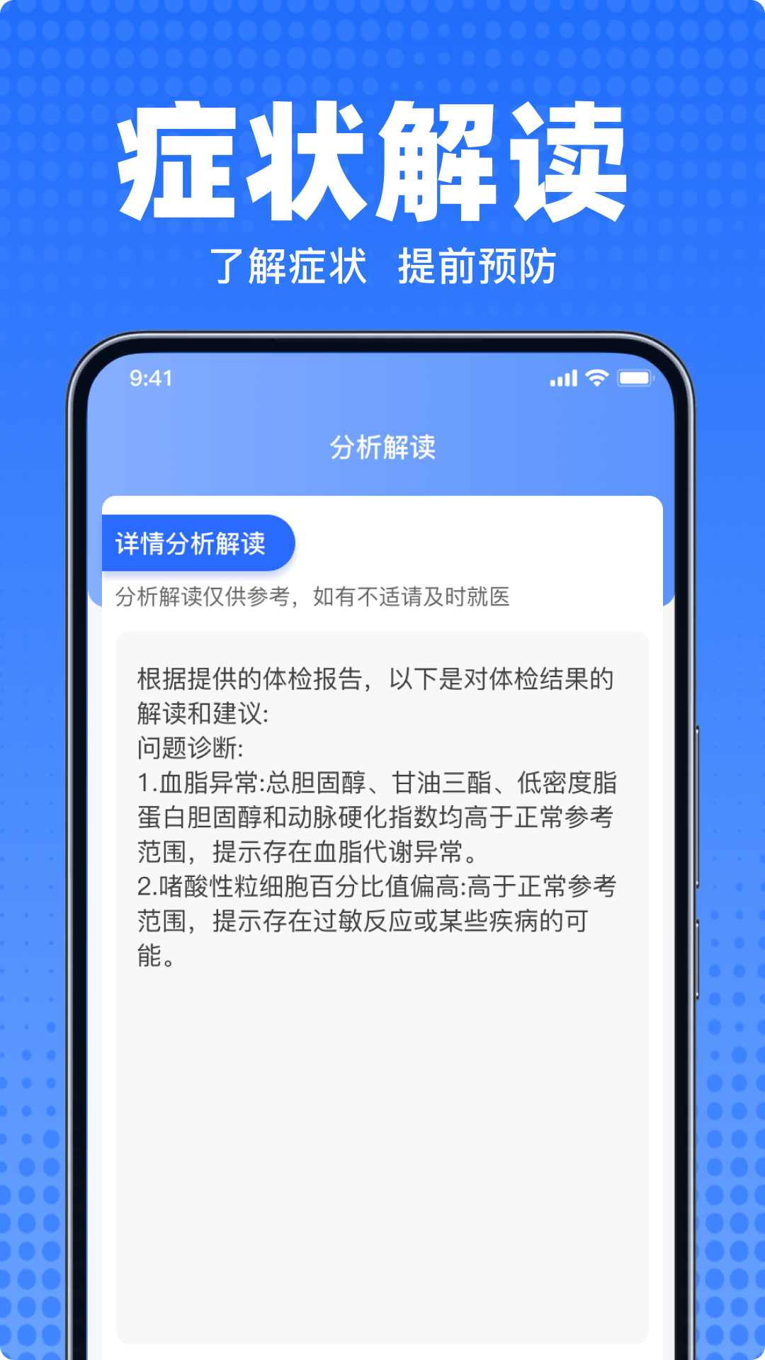 在快节奏的现代生活中,健康管理成为了每个人不可忽视的重要课题。但面对复杂的体检报告,密密麻麻的数据和专业术语往往让人一头雾水,难以准确理解自身健康状况。体检报告解读专家是一款集智能体检报告解读、健康常识普及、体检档案云端保存于一体的全方位健康管理应用,让健康管理变得简单、高效、贴心。