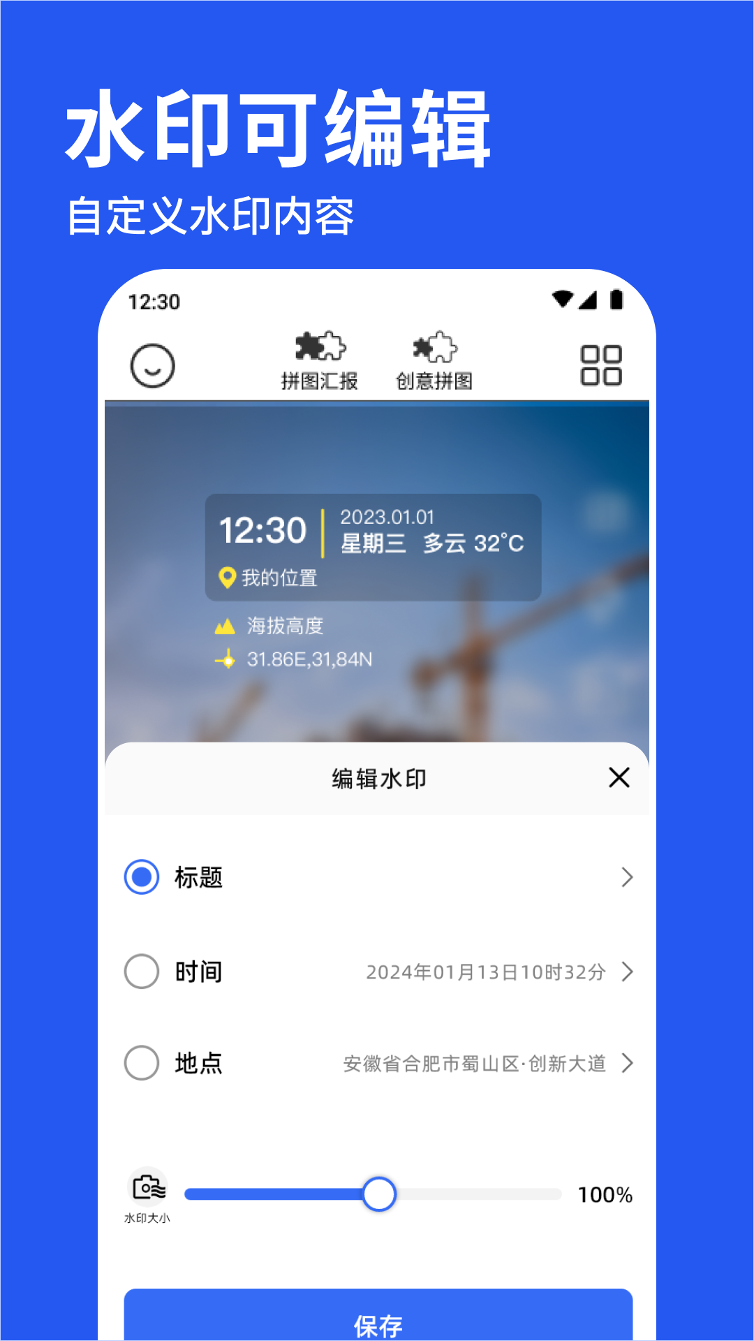 时间、地点、经纬度、天气、湿度等多种水印功能,更好的记录水印照片。