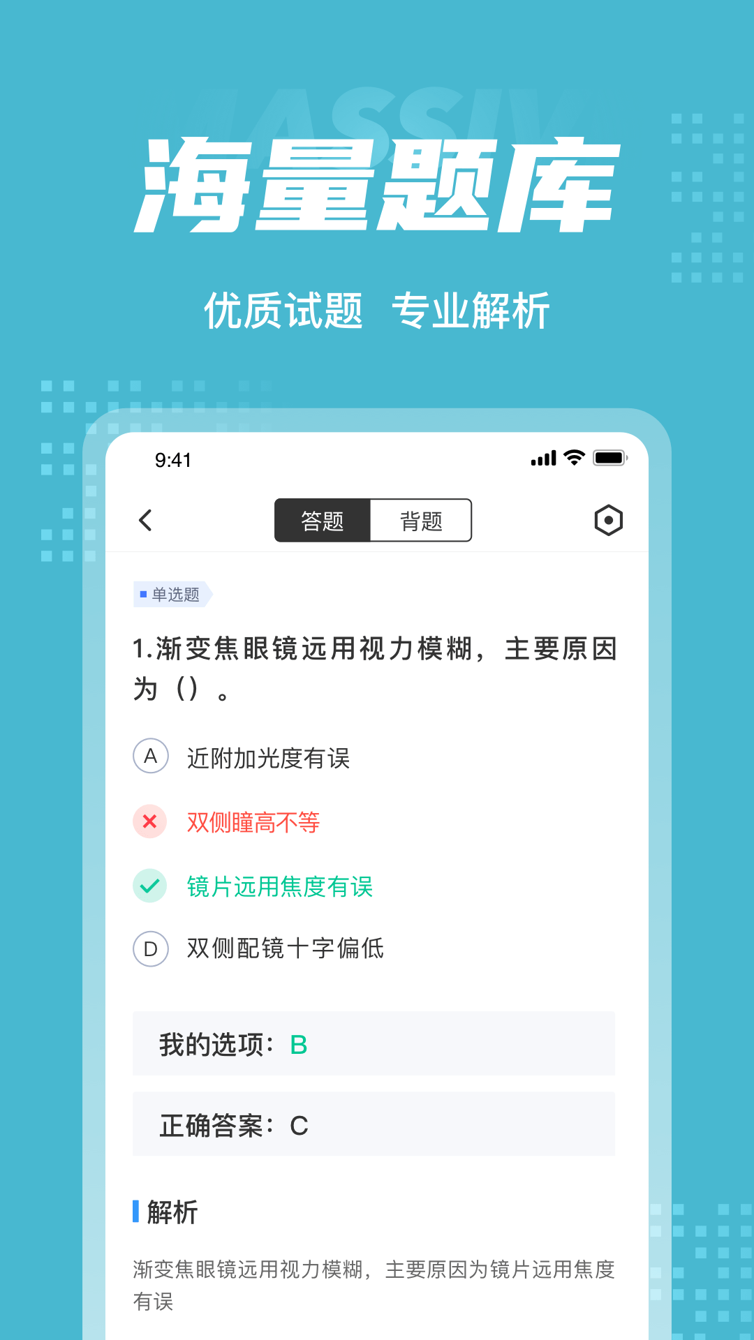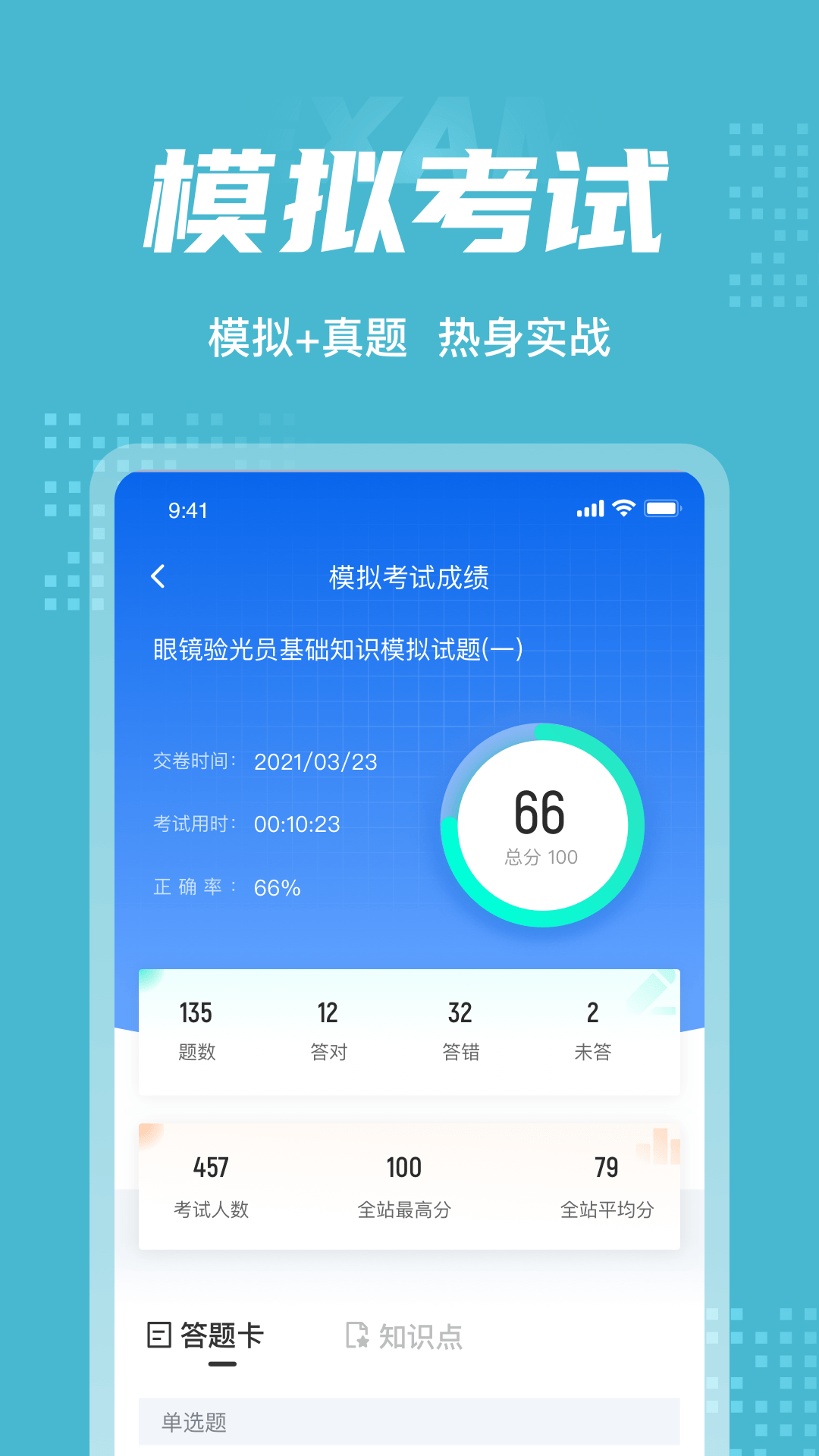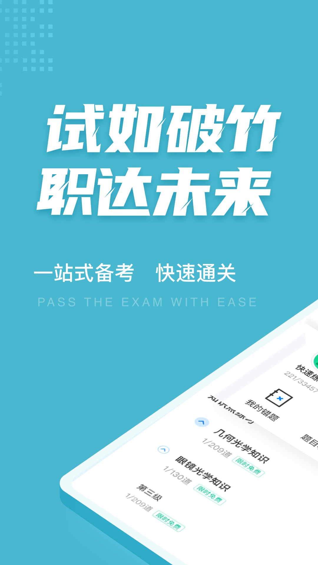 眼镜验光员题库内含考点练习,全国通用卷以及地区卷模拟练习,以及按照固定考试比重的随机式的抽题的真题考场,成绩单实时记录考试数据,一点一滴的反馈考生近期学习状态以及自我正确率的提升,大大的给予考生通过考试的信心。