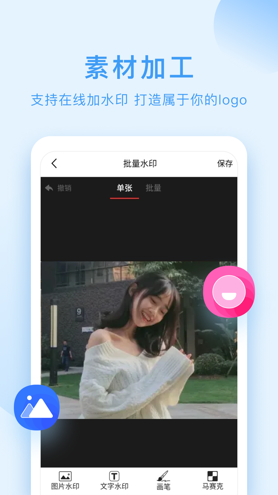 3. 微商水印:提供免费的微商作图水印服务,无论是文字水印,还是图片水印,各种水印自定义功能一应俱全。并且还有画笔、马赛克、箭头、圈点等水印功能,让您能够成为独具一格的微商水印制作大师。
