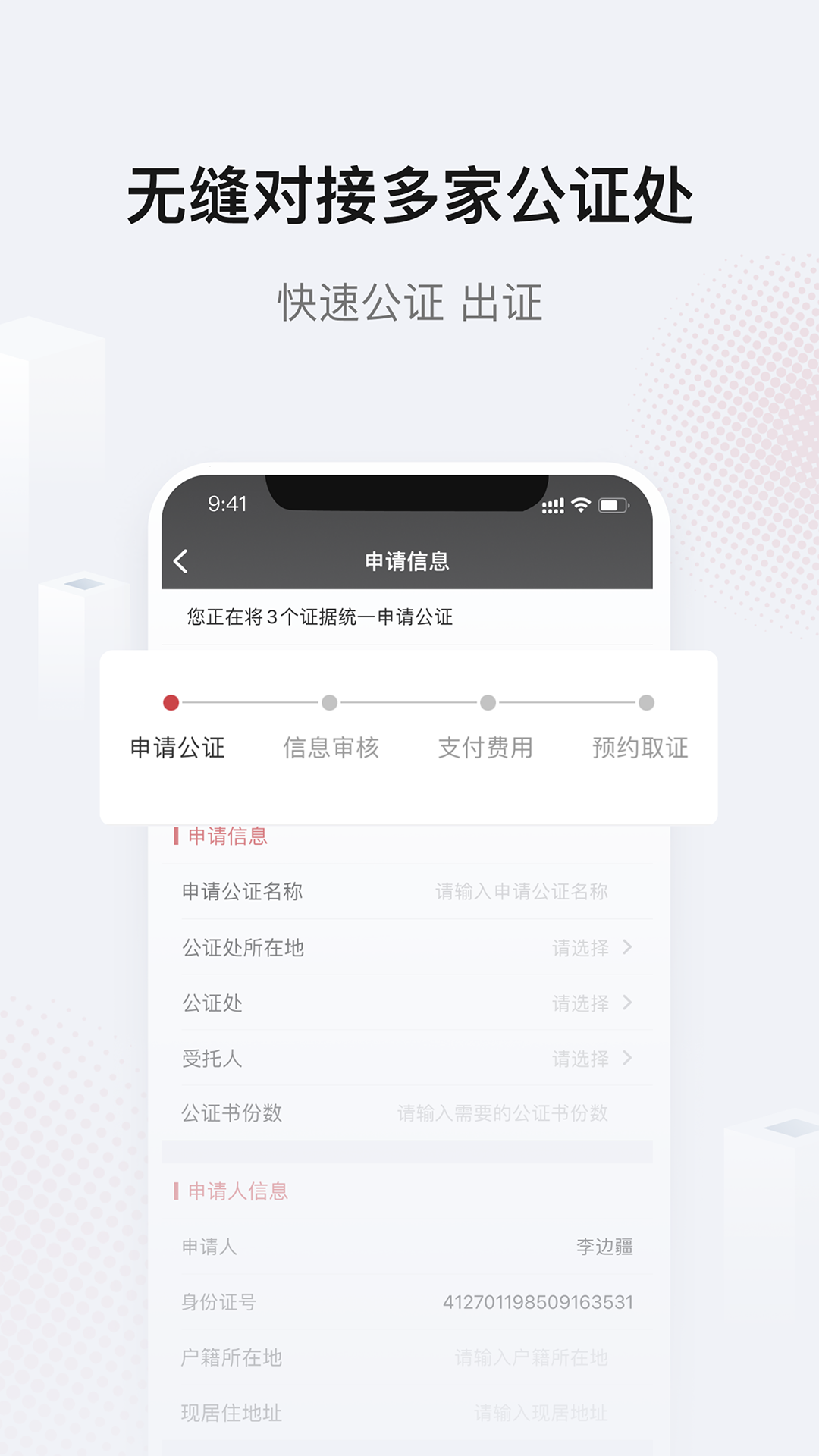 - 无缝对接多家公证处,一键提交文书申请公证,公证处会迅速进行审核报价,进而出具公证书。