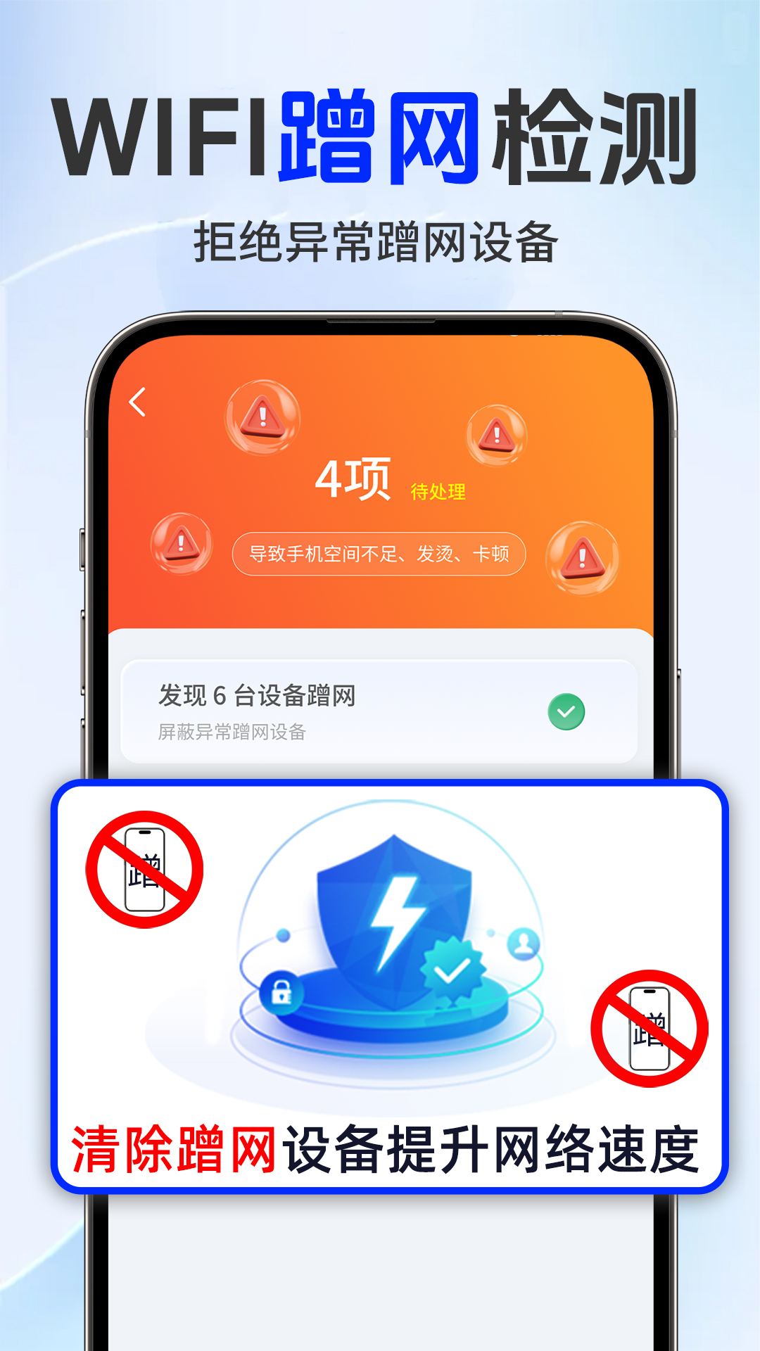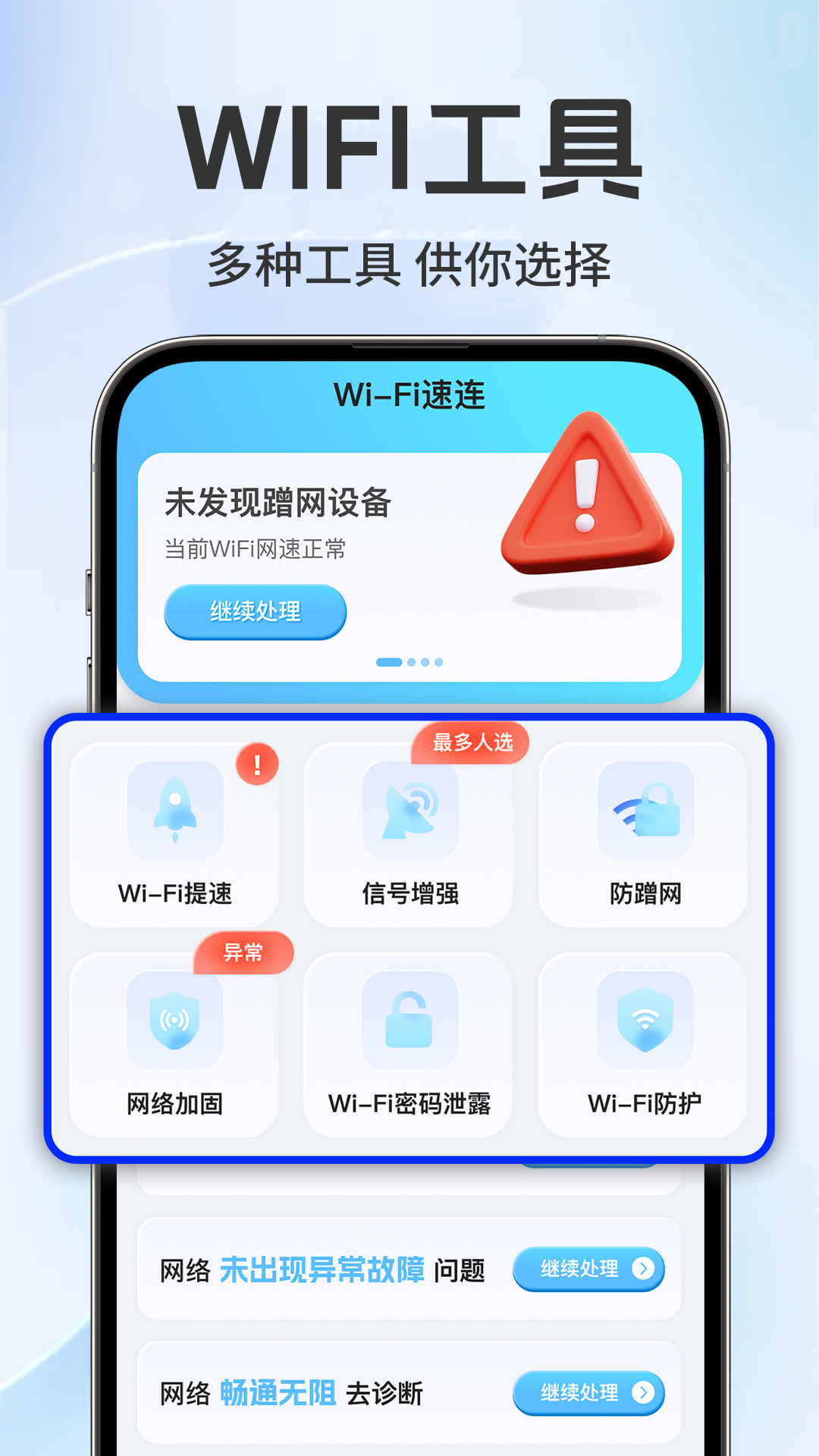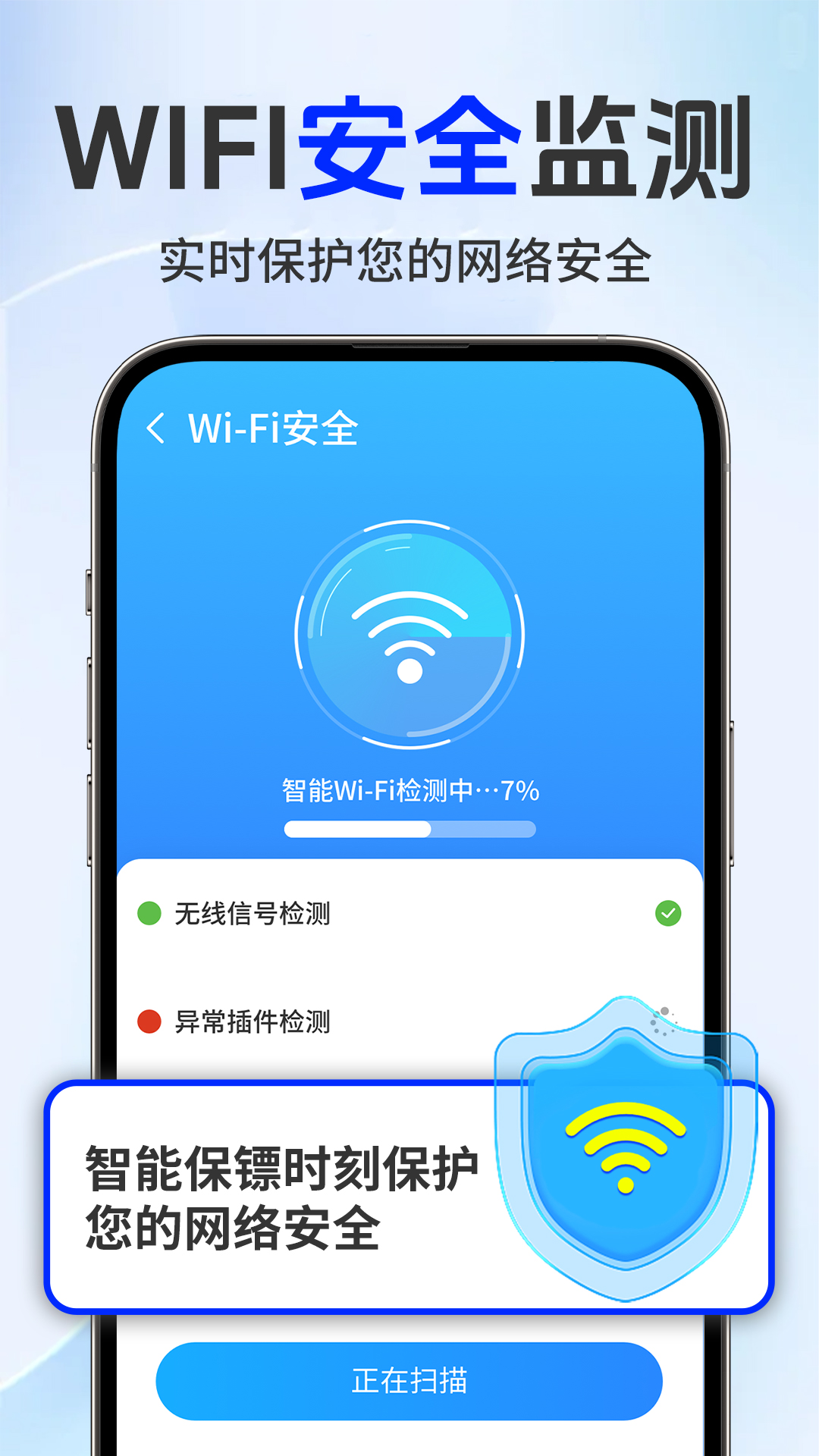WiFi万能直连,保护您的上网流量不流失,还有好用的WiFi检测等功能,让您的上网体验更加安全、舒心。