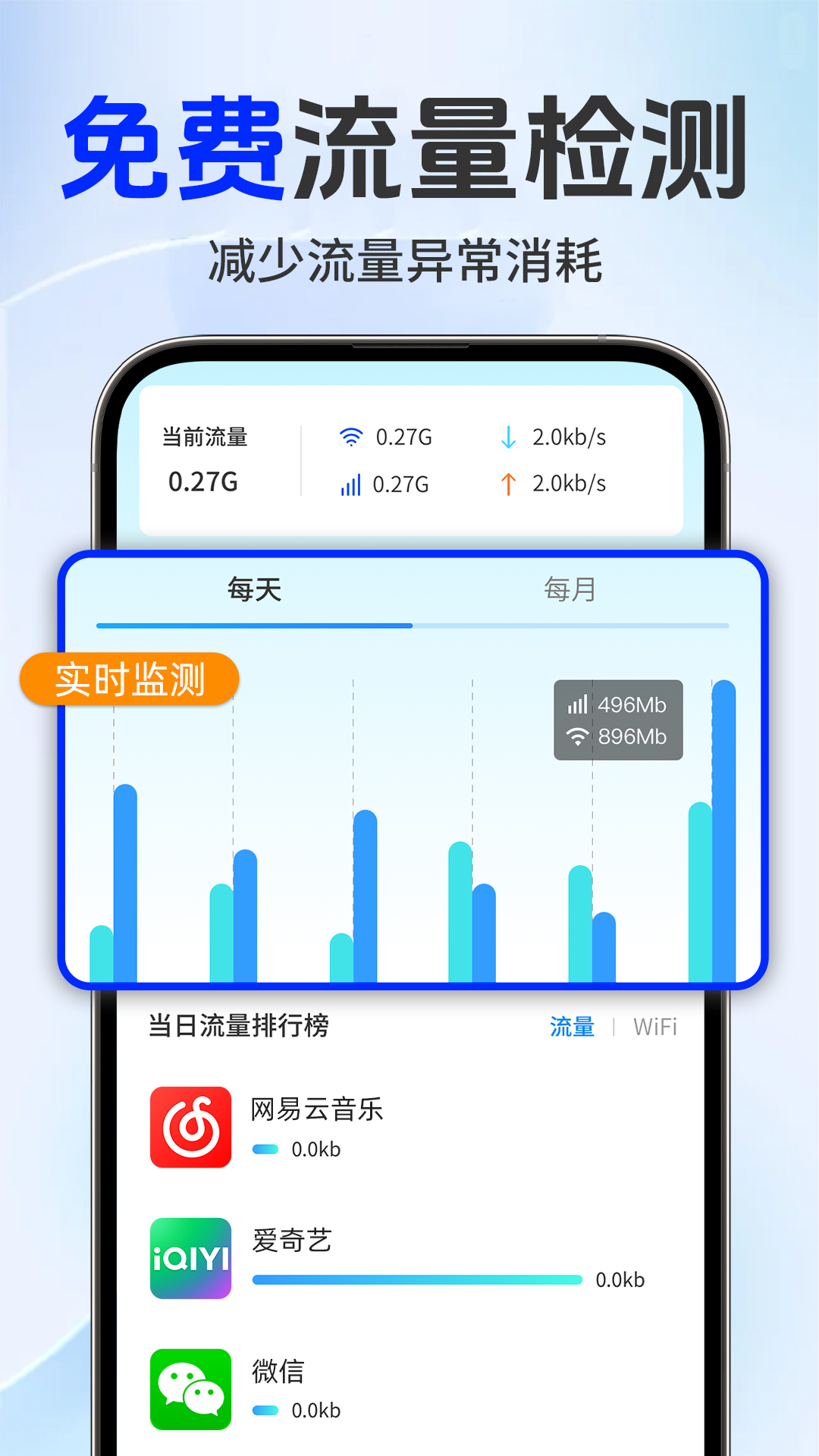 1、流量统计:实时统计手机安装应用的流量使用情况,再也不担心流量用超了。