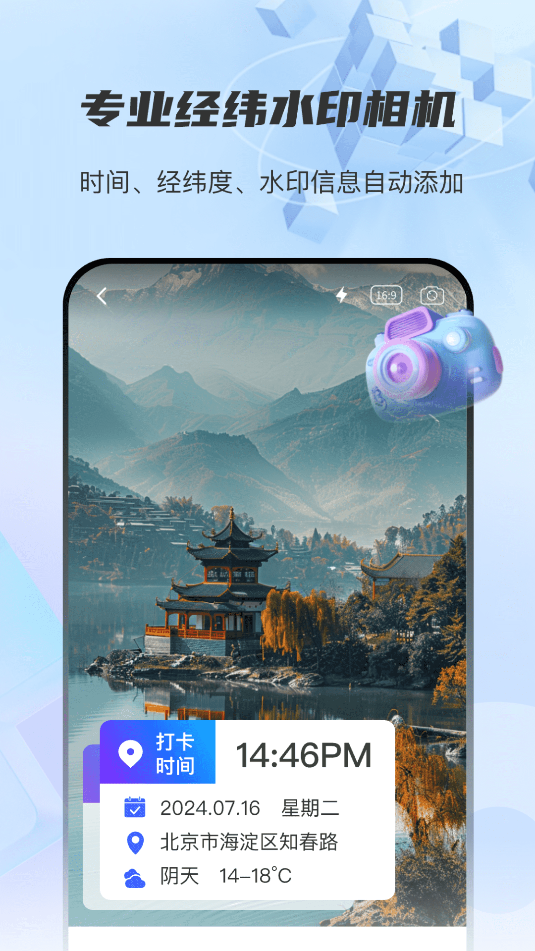 这是带有特殊功能的经纬相机,拍摄图片时会自动记录位置信息。而且提供海量的水印模板,无论是考勤打卡、上班打卡、工地打卡、工程打卡,还是站岗执勤打卡等场景所需的时间水印模板都能随心使用。