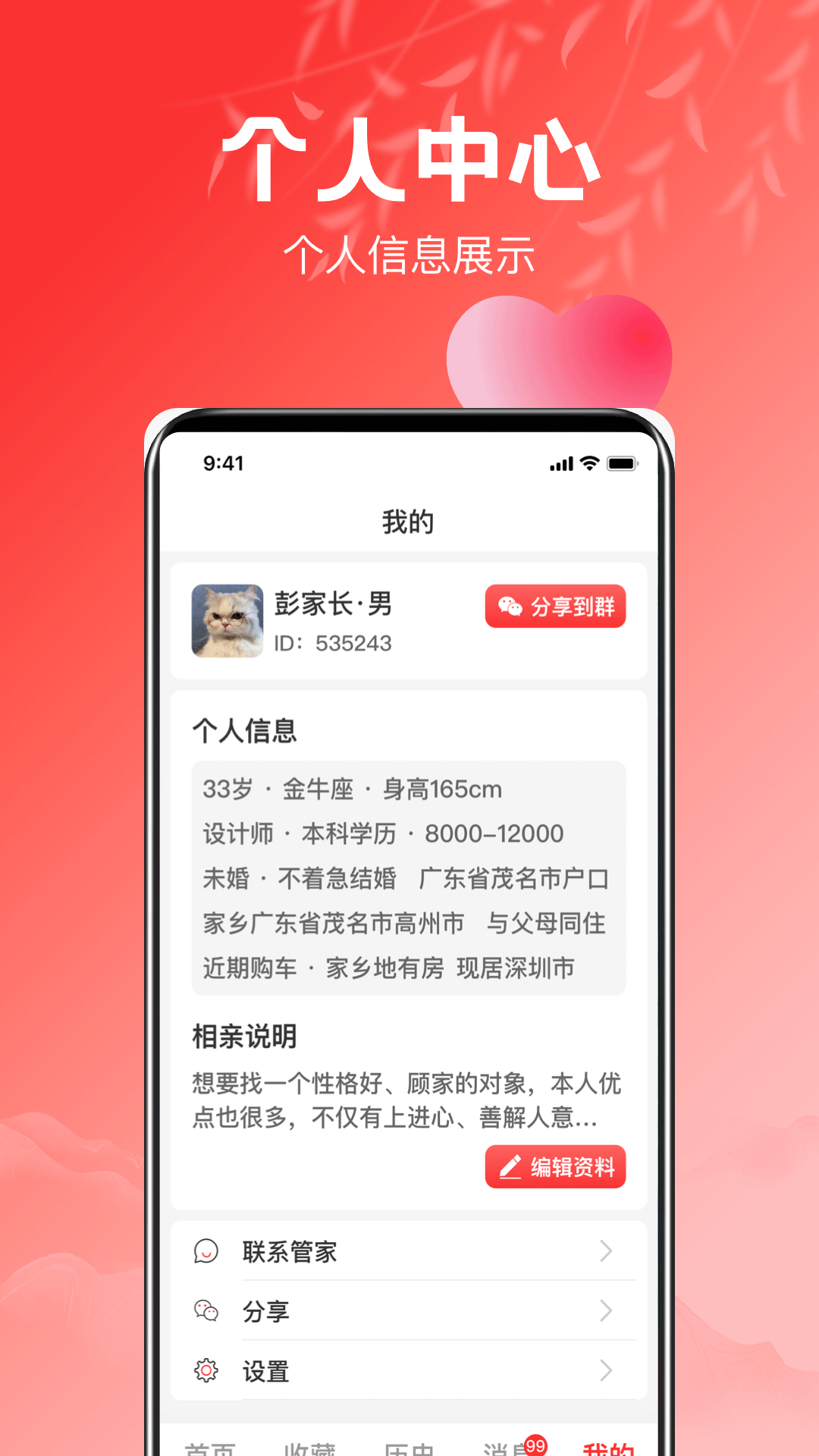 【简洁专业的界面】为家长代征婚提供人性化的简洁界面,操作起来更方便、更高效。
