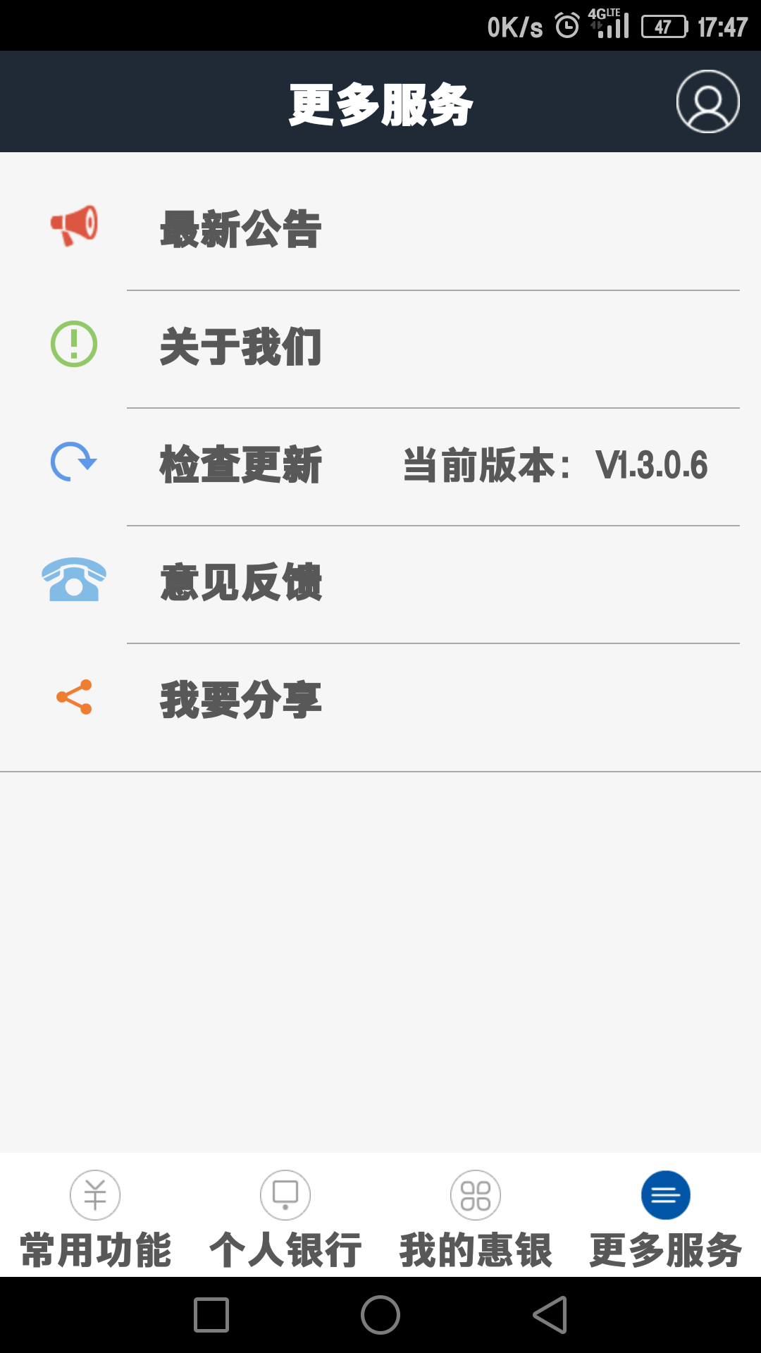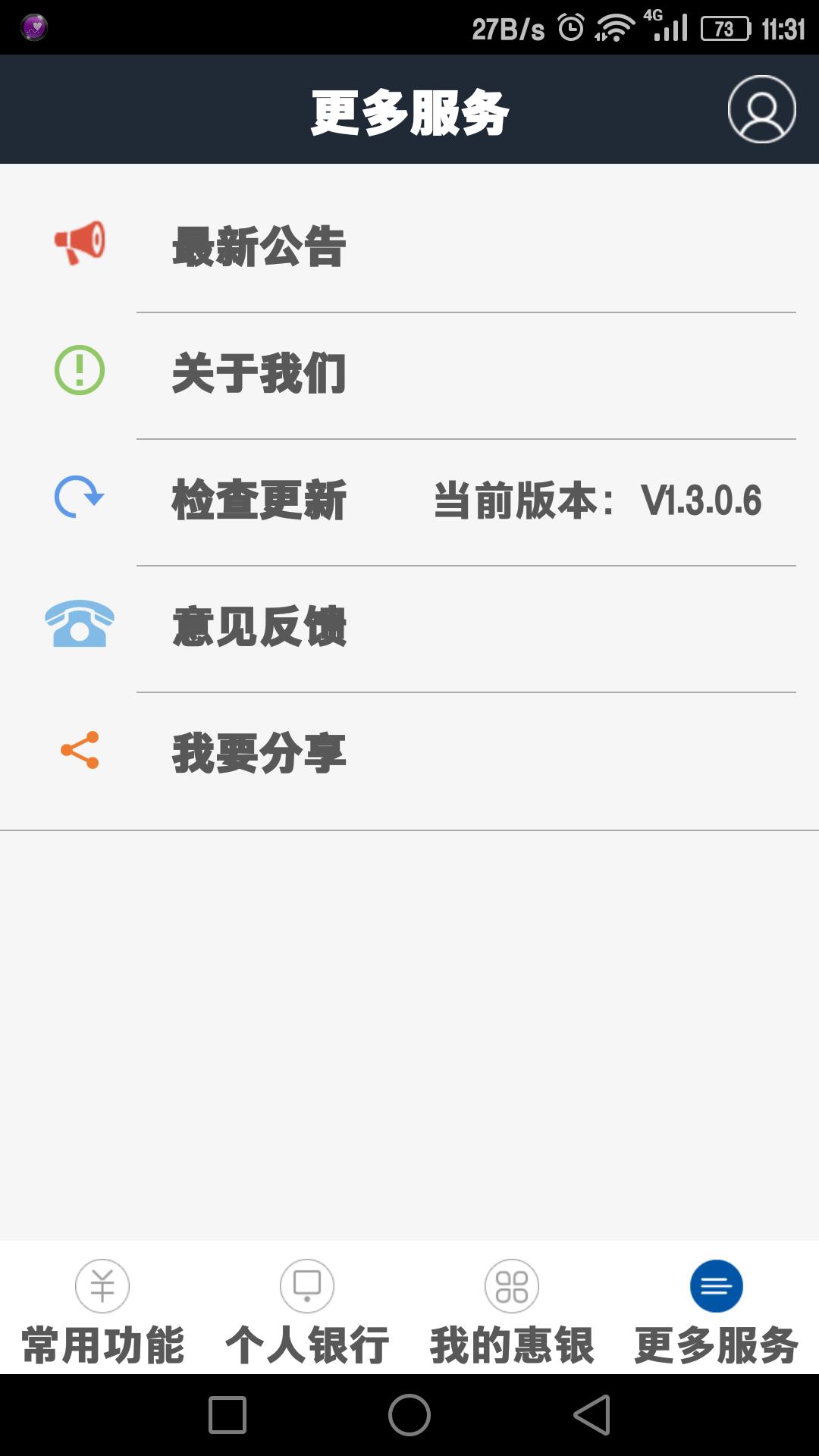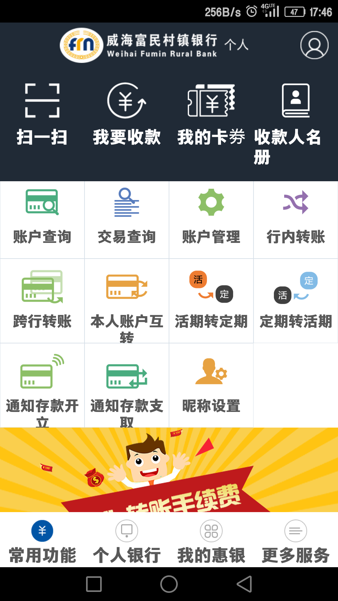 威海富民村镇银行手机银行是为智能手机和移动终端用户量身打造的移动金融服务平台,创建“常用功能”、“个人银行”、“我的慧银”、“更多服务”等金融服务专区,为您提供丰富实用的金融服务。个性易用的功能布局、全新流畅的使用体验,助您移动金融和移动生活更时尚精彩,让你充分享受移动生活的乐趣,是时刻陪伴在您身边的理财生活好帮手。