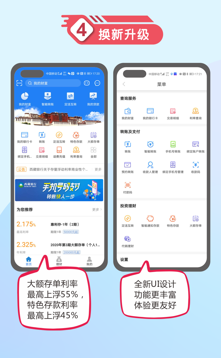 西藏银行手机银行全新登场啦!新版手机银行是西藏银行专为手机银行客户精心打造的移动金融新平台。此次平台进行了多功能与安全性的升级: