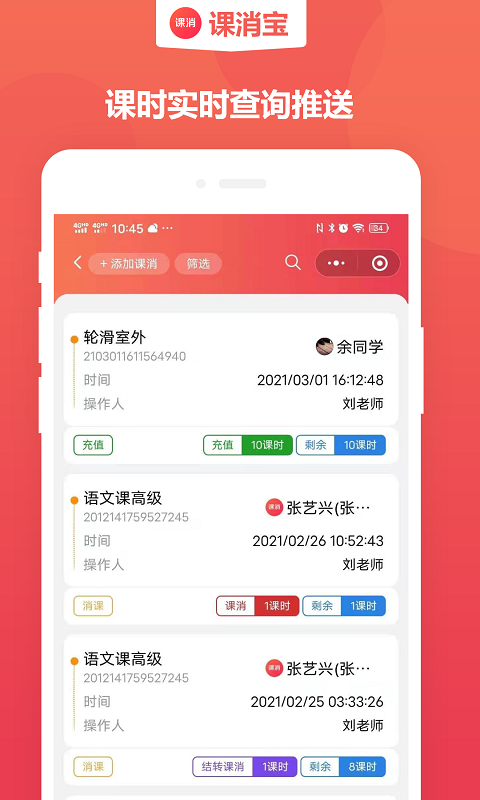 课消宝会及时推送学员课消记录,并且支持学校独立公众号。信息透明可查询,有助于提高学员满意度。教师能清楚地知晓每次课程的学员情况,而且课消记录、明细以及剩余课时都方便查询。