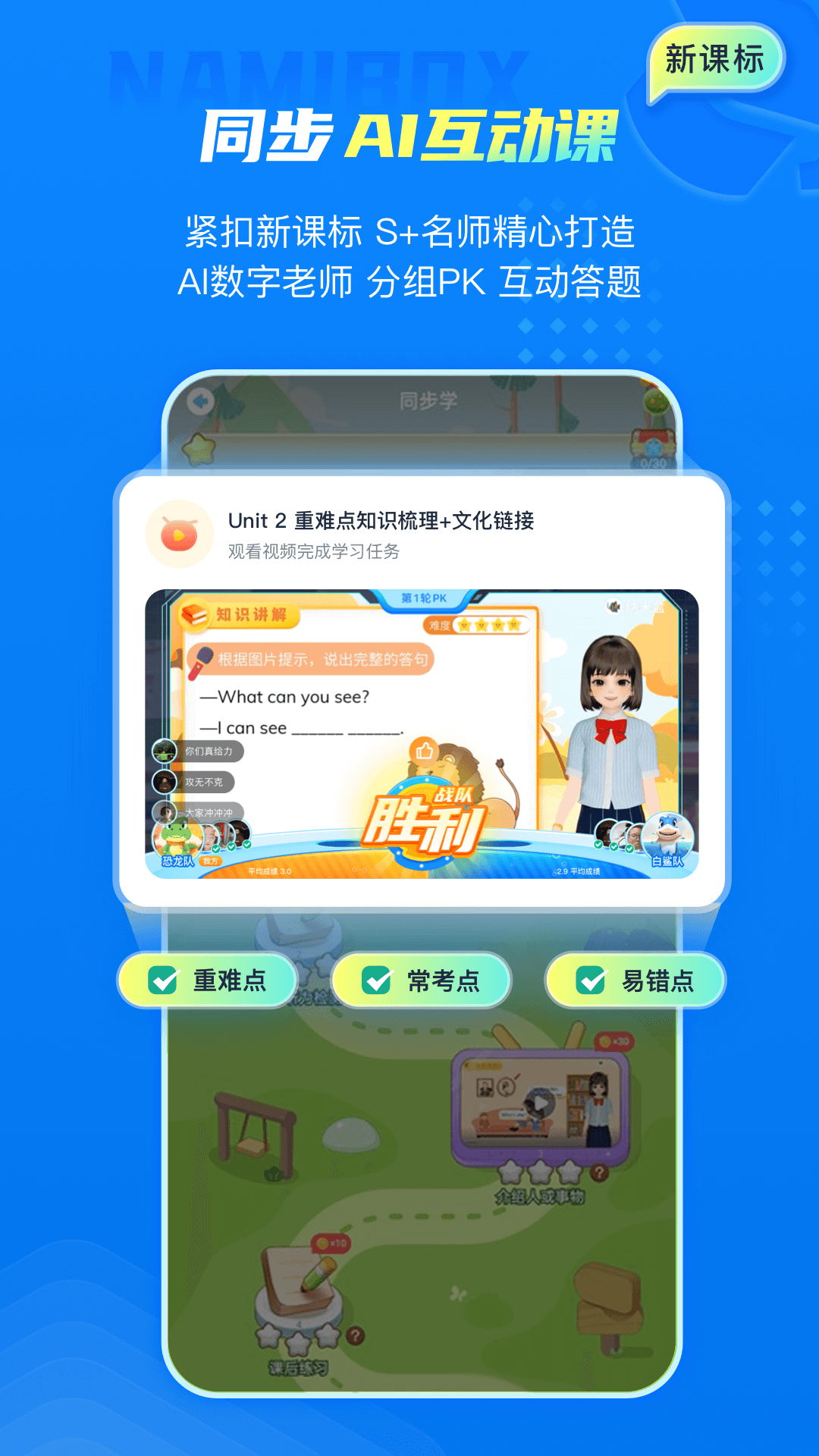 每个单元5-10节满分精讲同步AI互动视频课,AI数字老师,分组PK互动答题,每节课5-10分钟,讲透一个重难点