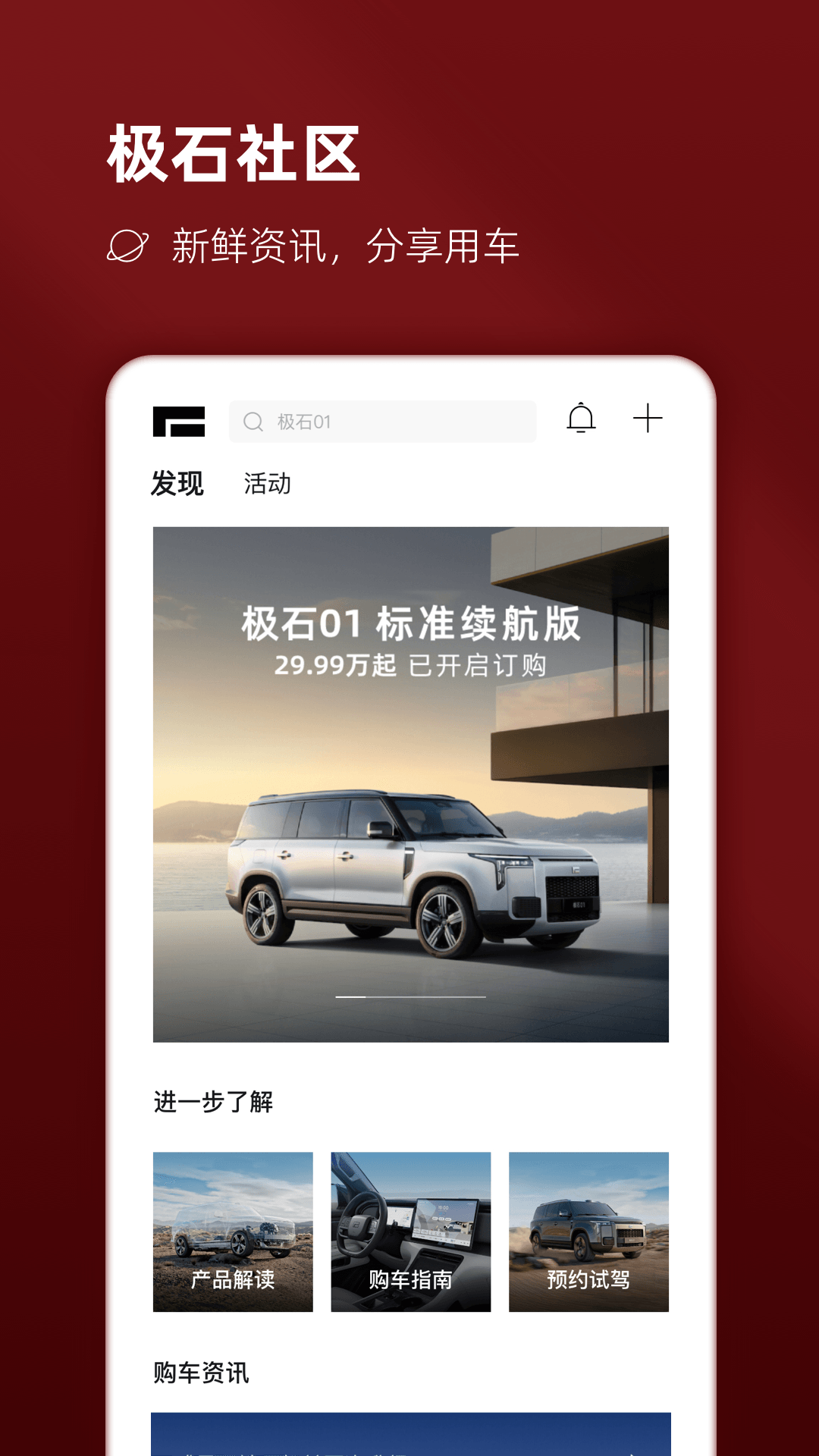 探索板块:您可以全面知晓极石汽车的官方资讯以及产品动态,还能享受到贴心的看车服务。