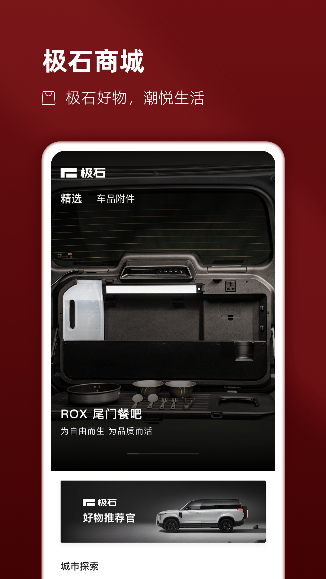 商城板块:这里有车辆延展件、高品质配件可供选购,还有极石品牌的周边等精美露营好物,让您的用车生活更加便捷。