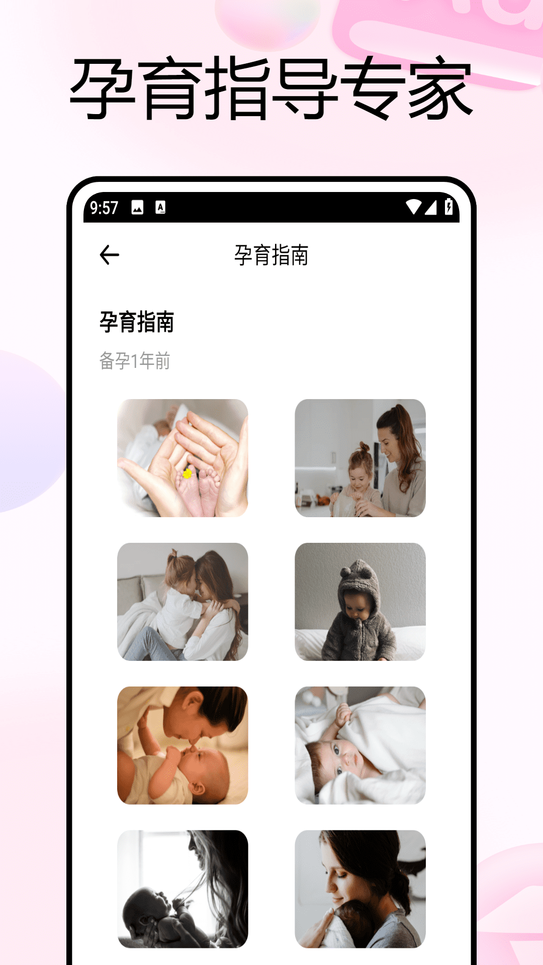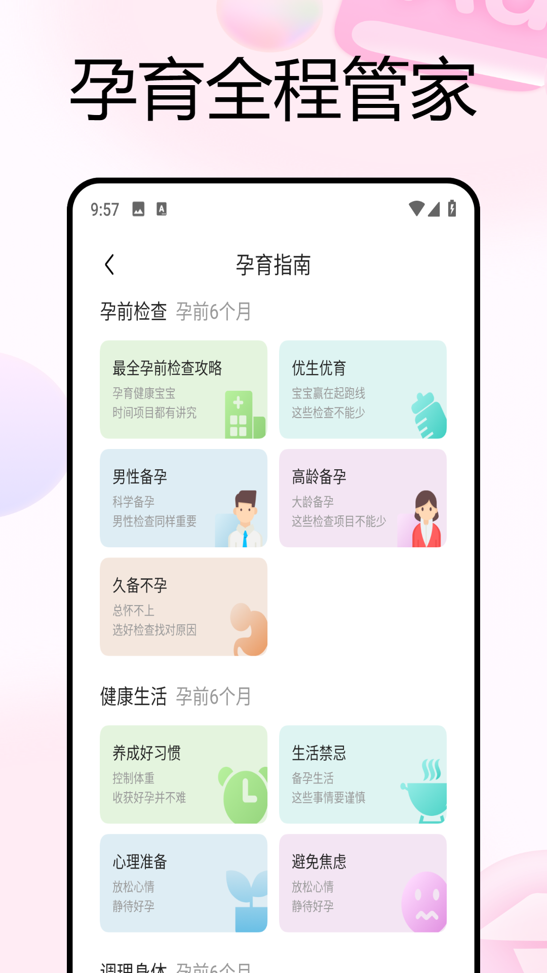 【孕育指南】能给予助孕运动、备孕检查、良好习惯养成、生活禁忌、焦虑避免、心理准备等方面的知识。