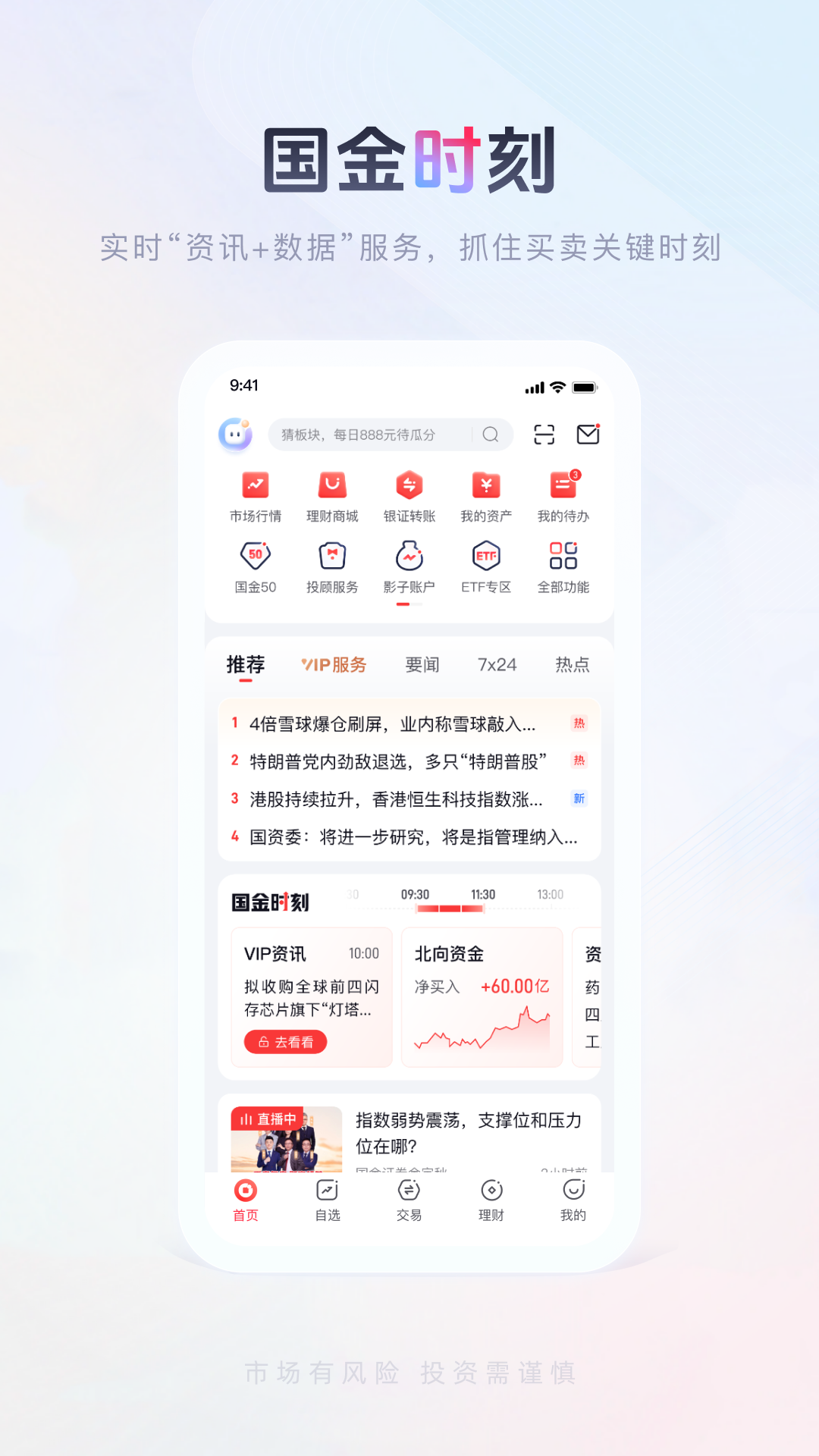 6. 丰富的用户互动服务:提供7x24小时智能客服、模拟炒股、ETF基金大赛、国金积分、国金财富号等互动服务和活动。