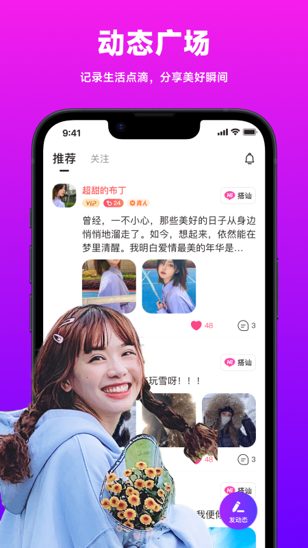 此外,微陌app还具备多种充满趣味的社交功能,发布动态就是其中之一。通过这些功能,你可以在此结识到更多志同道合的朋友,从而构建起属于自己的社交小圈子。不管你是想寻找恋人,还是希望拓展自己的社交范围,微陌app都能够满足你的需求。